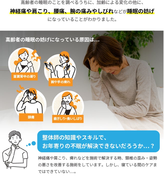 本プロジェクトは、お客様に施術をさせていただく中で、よく高齢者の方から「寝つきが悪い、眠れない」というご相談からを受けたことから始まりました。そこにヒントを得て、高齢者の方がお持ちのお悩みを「使う枕を変えるだけで解決できるのでは?」と、柔道整復師の視点から考案する、正しい姿勢を保ち快適な睡眠を可能にする枕の開発に没頭してまいりました。