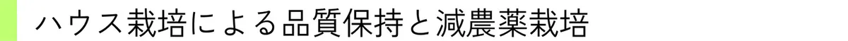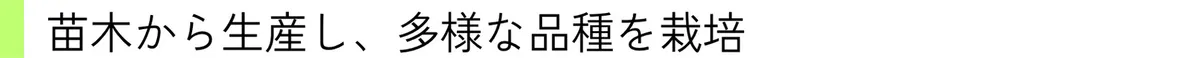 当社はハウス栽培により、減農薬を実現し、土壌の調整や施肥にもこだわりを持って取り組んでいます。また、果樹園を始めたい方への就農応援プロジェクトにも力を入れ、農業の未来を支える活動を行っています。