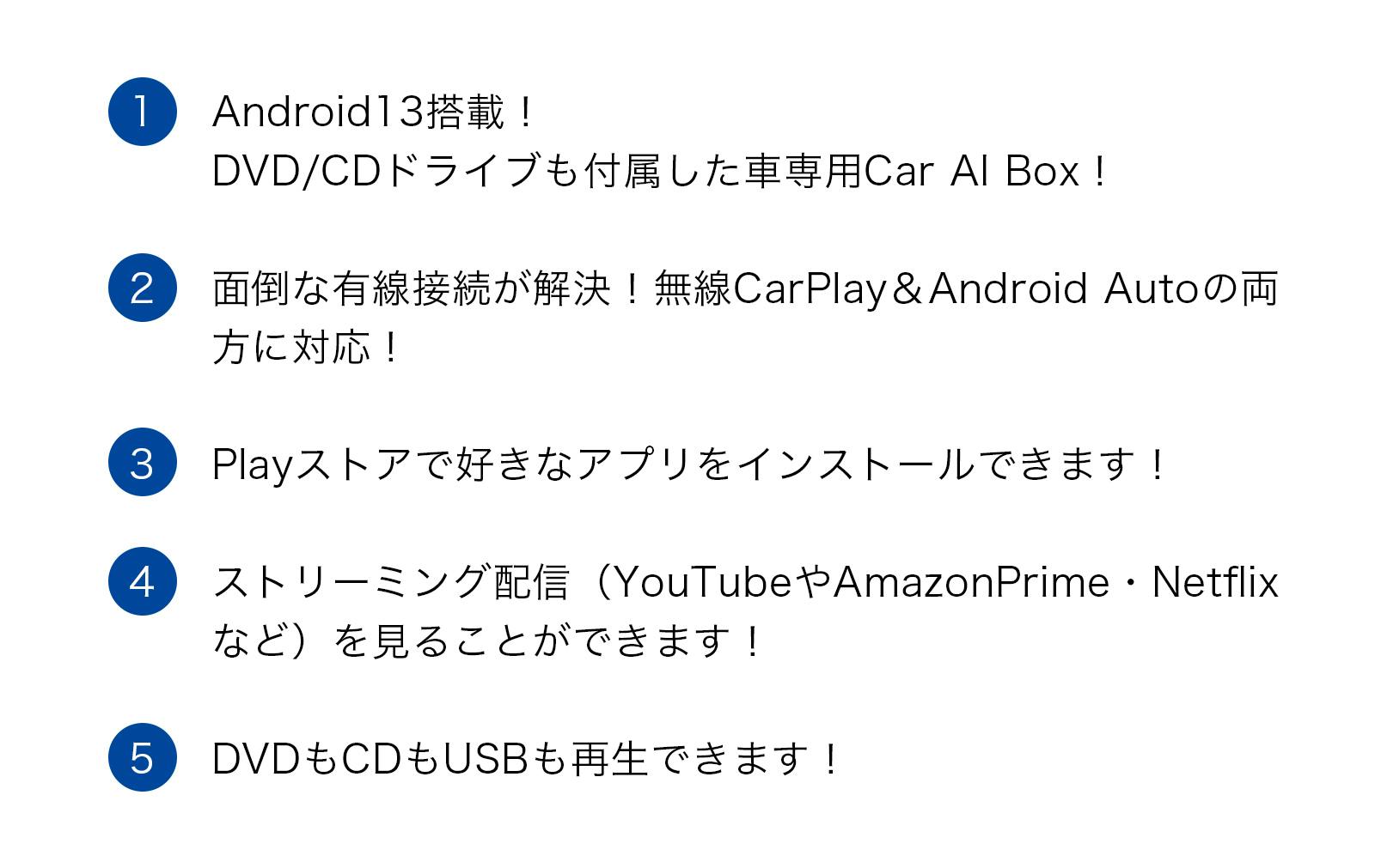 ※市販のDVD・CDのみ対応、ブルーレイDVD・CPRMが再生できかねます。車の相性やディスクの年式・劣化・状態・フォーマットなどによって日本市場向けのDVDでも再生できない場合があります。