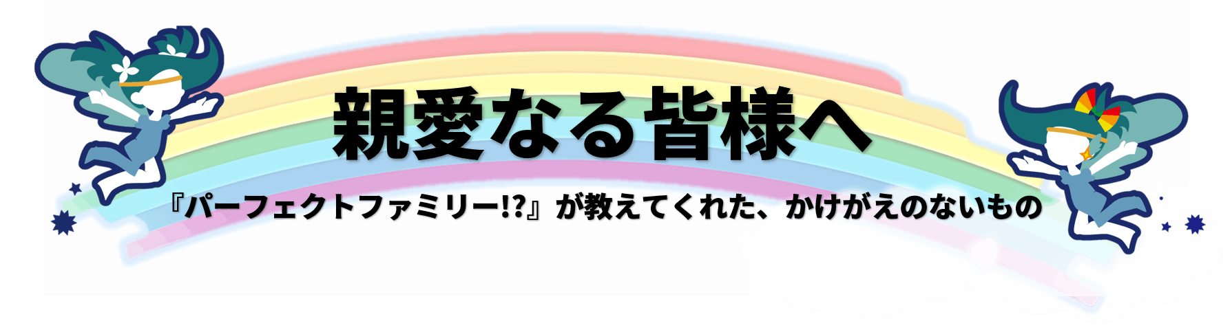 私が『パーフェクトファミリー!?』に出会い、夢と希望を持ち、今日まで生きてくることができたように、この作品を通して、両親や兄弟、おじいちゃん、おばあちゃん、親戚も友達もみんなが笑顔になり、笑顔の輪が広がっていくのを感じました。