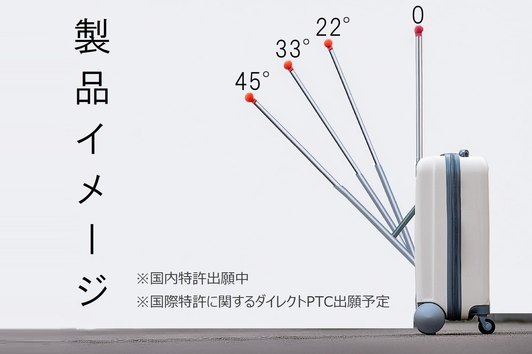 一般的なキャリ―ケースは、本体に収納しているハンドルを垂直に伸ばして使用しますが、『らくぱる』は緻密で独特な構造(特許申請中)により、角度を変えられるハンドルとケースが一体になっており、ケースが直立したままで引き歩きや押し歩きがしやすいのが特徴です。