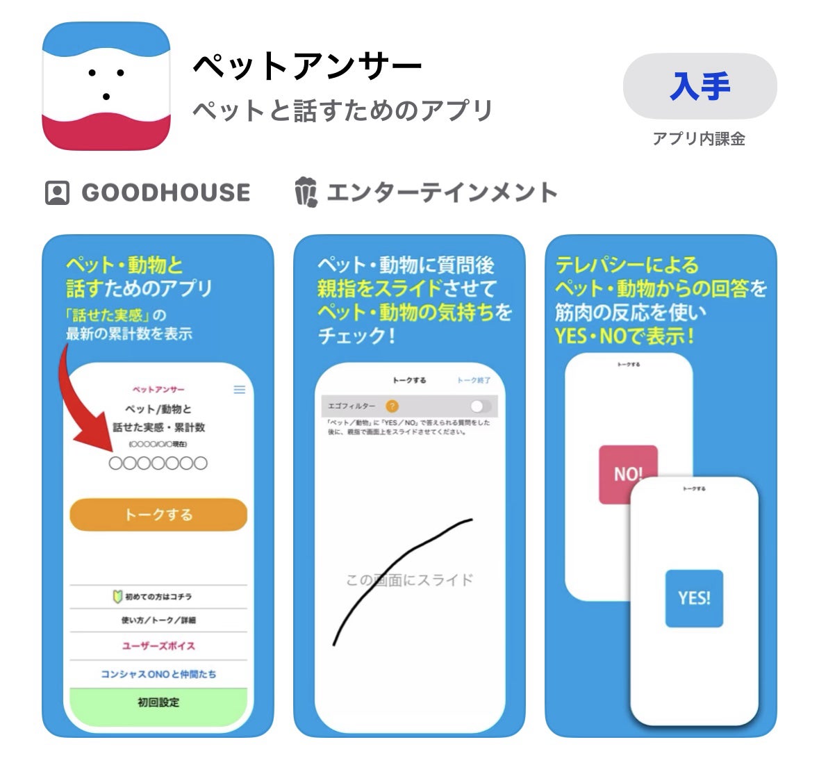 「ペットアンサー」は、ペットや動物に語りかけ、そのテレパシー反応をスマホ操作で読み取るアプリです。