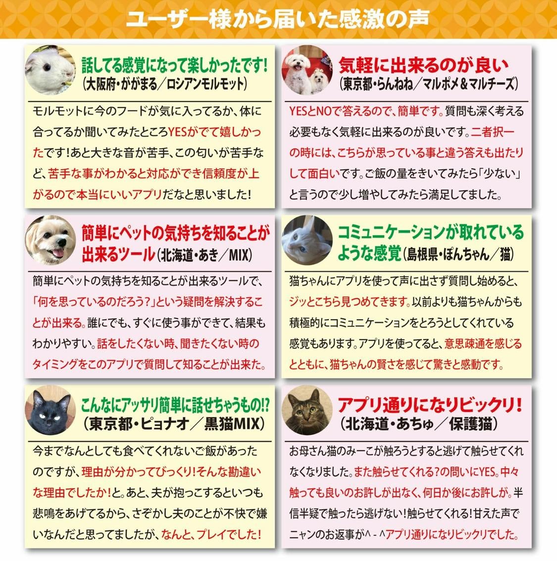 残念ながらまだ科学的証明はできませんが、皆さまにアプリを使用していただいた結果として、「私たち人間がペットや動物と話せるのが当たり前の世界」を実現させ、彼らとの心豊かな共生、そして共に幸せで愛溢れる世界を創って行けましたら幸いです。