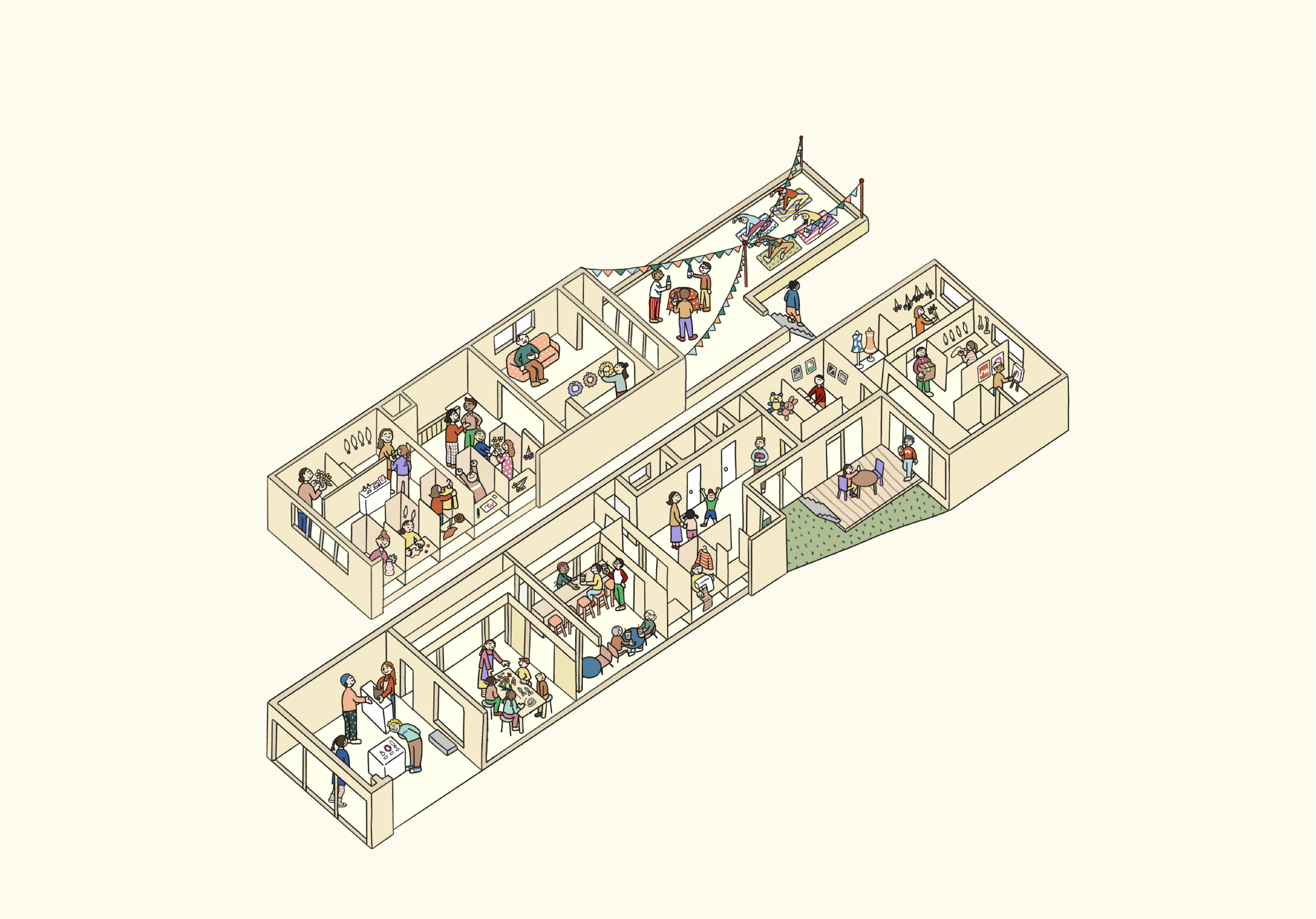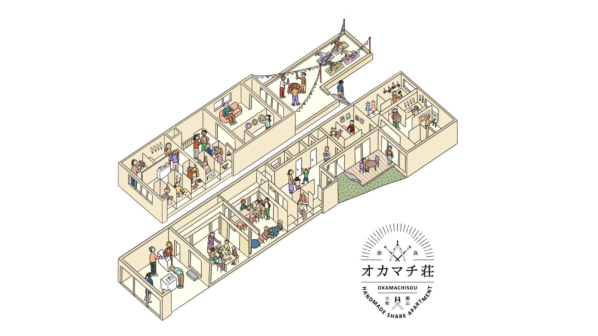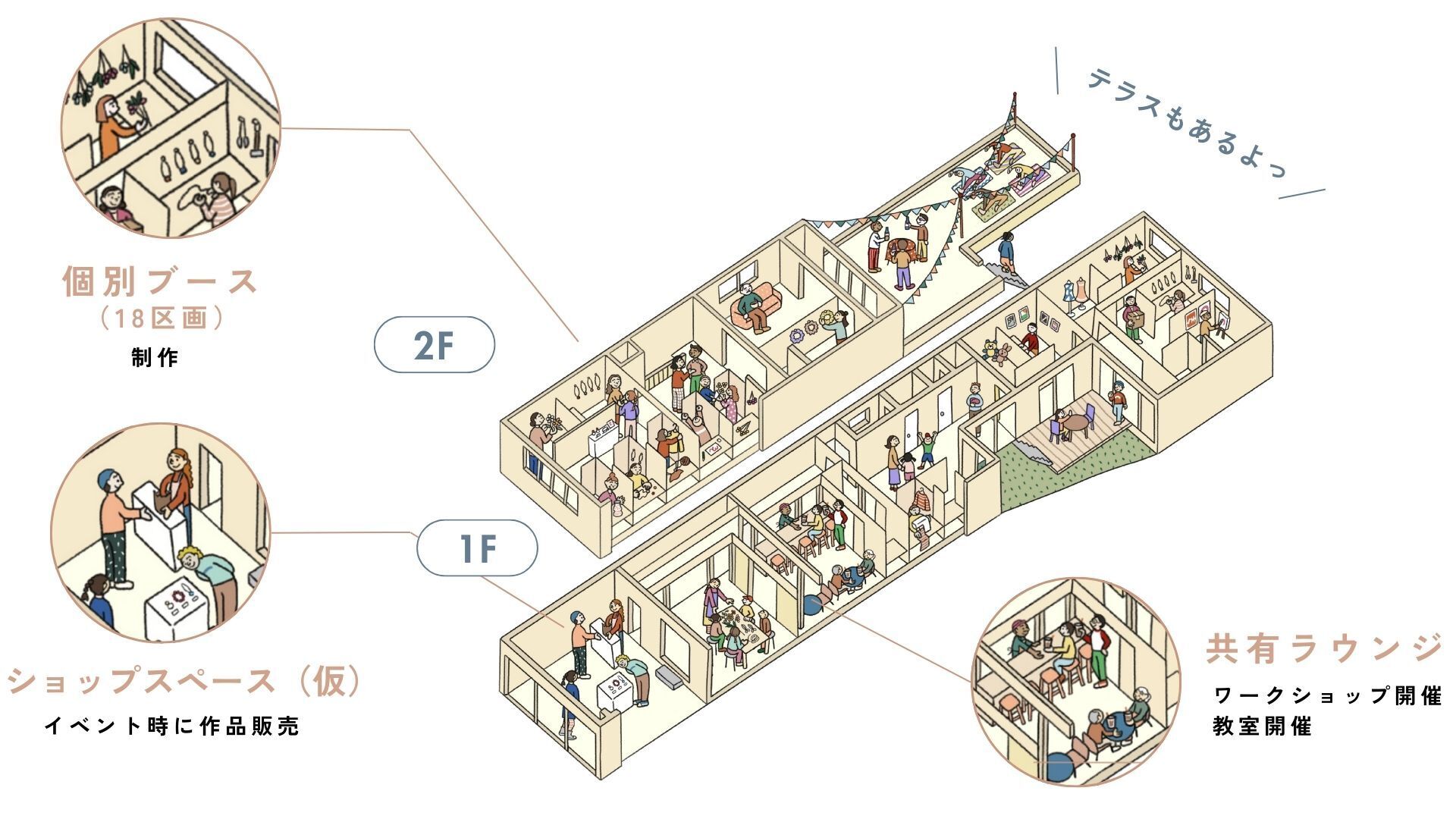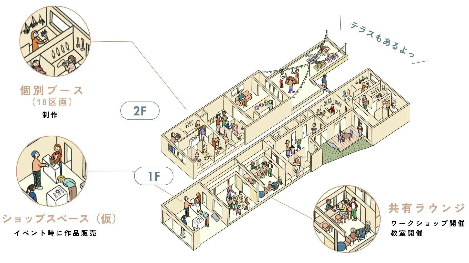 オカマチ荘には、個別ブースを18区画(予定)、イベント時に作品販売ができたり自身の作品の展示ができるオープンスペース、そしてワークショップやまちの人がふらっと遊びに来れる共有ラウンジを作る予定です!