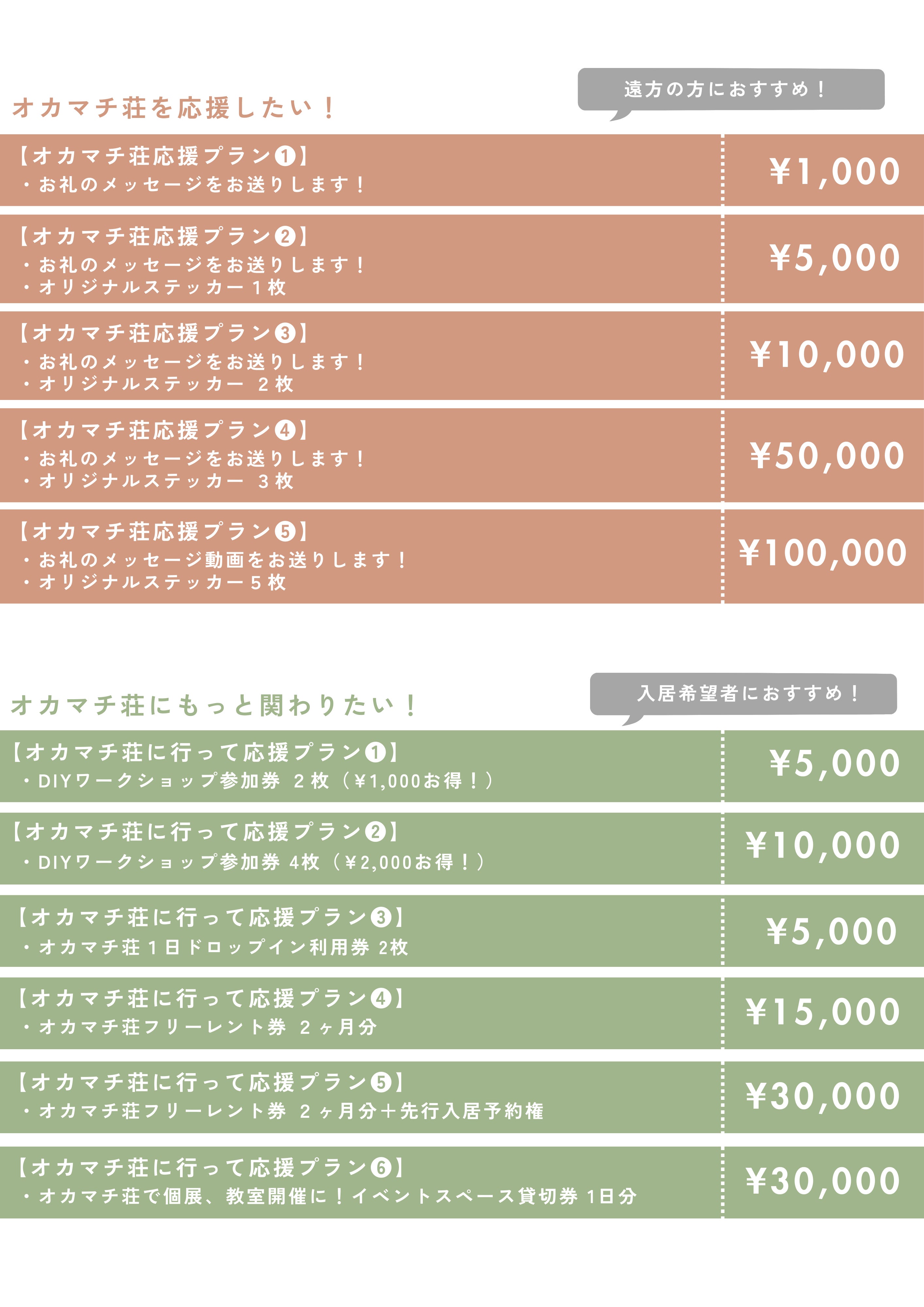 今回集めた資金はオカマチ荘の改修工事費等の一部にあてさせていただく予定です。