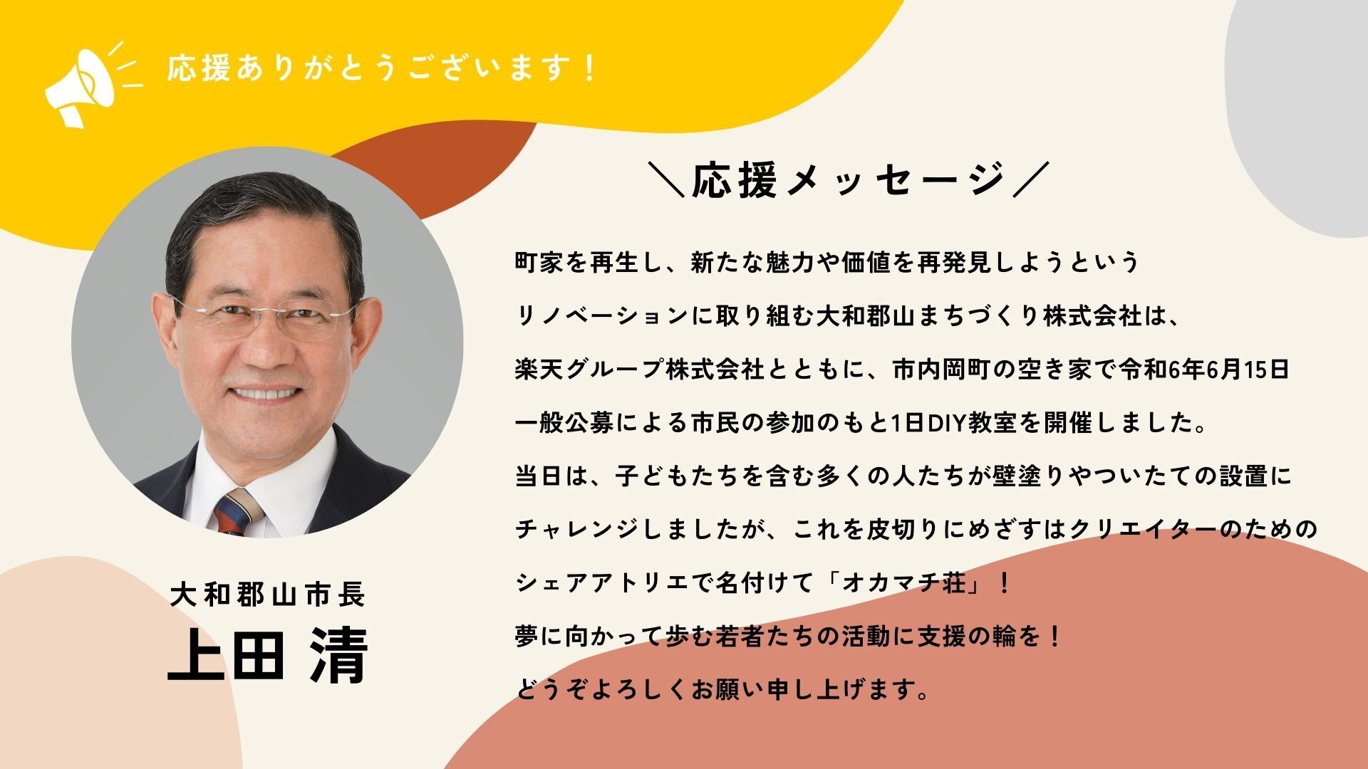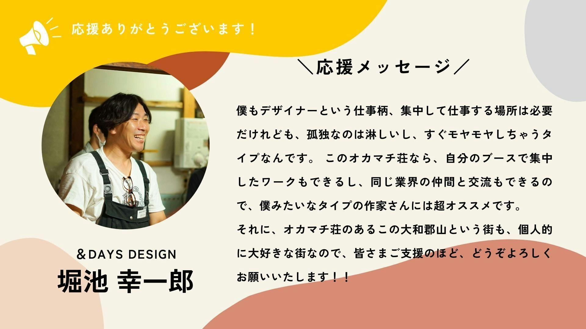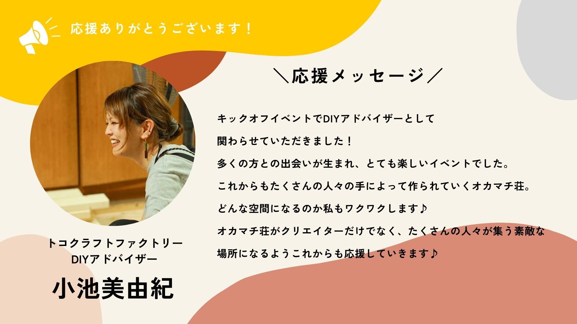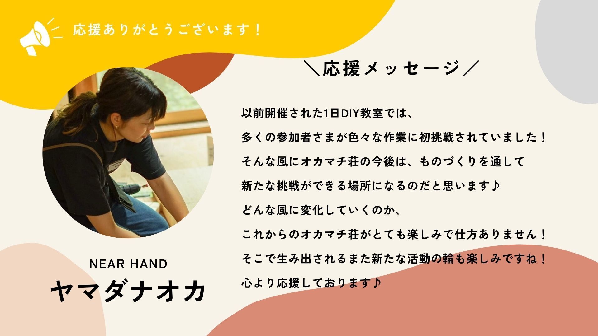 2024/12/30 17:54オカマチ荘のクラファンにご支援いただいた皆様、ご無沙汰しております!9/2〜9/30まで行ったクラウドファンディング、目標金額150万円のところ、1,768,115円を達成することができました。見守っていただき、本当にありがとうございました。あれからどうなの???ということで、リターンとプロジェクトの進捗状況をお伝えさせていただきます。リターンについてリターンにつきましてですが、準備の出来たものから順に以下オカマチ荘メールアドレスからメールを送っております。以下の送信済リターンに当たる方はメールをご確認いただければと思います。■メールアドレスokamachisou@gmail.com■送信済リターン・満と散歩・お礼のメッセージ(1,000円)・DIYワークショップ参加券・KISSA 飲食チケット ¥5,000分・宣材写真撮影券(一部)プロジェクトについてあれから3ヶ月。徐々に、徐々に、進んでおります。まずは時系列にご紹介!---------------------------------------------------------------------------9/29(日)入居者説明会9/29(日)DIY workshop #19/30(月)クラファン終了10/6(土)DIY workshop #210/13(日)DIY workshop #311/12(土)YAMATOKORIYAMA CRAFT MATKET 出店者募集開始11/13(水)大工さん工事11/16(土)DIY workshop #411/23(土)DIY workshop #511/24(日)入居者説明会11/24(日)DIY workshop #611/30(土)DIY workshop #712/7(土)DIY workshop #812/15(日)入居者説明会1/25(土)YAMATOKORIYAMA CRAFT MATKET 開催---------------------------------------------------------------------------■ まずは、DIY workshop!9/29から12/7まで、全部で8回のDIYワークショップを開催しました!近所の方やクラファンで知ってくださった方など累計60名の方が参加してくれました。オカマチ荘内の塗装をしたり、ブースを分けるパーテーションを一緒に作ってくれました~!参加した方は初対面のことがほぼでしたが(中にはお知り合いと再会した方も、、!)、一緒に作業をすることですぐに打ち解け、気付いたらワンチームになっていました。中には楽しかったからもう一度参加させてー!という方も、、!ワークショップは10:00〜17:00と1日を通して行うことが多かったです。その狙いとしては、近くのお店でランチをすることで、まちをもっと知ってもらいたい、ということ。さっき初めて会った参加者同士で一緒にランチに行ったり、私もご一緒させていただいたりして、いろんなお話が出来てとても良い時間でした。「近くに住んでるのに知らなかったから、教えてもらえて気づけてよかった」「子供の頃から住んでるけど、新しいところが沢山あるんだね。行けてよかった」など、まちを知るきっかけがつくれたな、と感じてます。ここでの出会いが中々に濃厚で、、!オカマチ荘の2軒隣のビルを購入されて自身のアトリエと造形教室を計画されているという美術の先生がワークショップに参加してくださって、1月に開催するマーケットの会場にも使わせていただけることになりました〜!私はオカマチ荘から歩いて5分のところにある柳町フラット内にあるKISSAというクラフトビールバルを最近始めたのですが、そこにオカマチ荘に前に住んでいたという方が偶然にも訪れて下り、ワークショップを見学にきてくださりました。ワークショップを通して、オカマチ荘をつくるだけでなく、まちの方が繋がり「まちにひらけた」オカマチ荘になっていっているなあ、としみじみでした。■ そして、大工さん工事!クラファンで集まった資金で、大工さんに畳を板材にしてもらう工事をお願いしました!■ 続いて、入居者説明会!全3回の入居説明会を行いました。オカマチ荘には全部で18ブースができる予定です。まだ完成ではないのでイメージが掴めない中ですが、6名の方が入居を希望してくださってます!何回か見にきてくださって想像を膨らませてくださったり、楽しみに待ってくださっているのでこちらも気合が入ります。■ 1.25に、YAMATOKORIYAMA CRAFT MATKET を開催します!オカマチ荘スピンオフイベントとして、まちを舞台としたクラフトマーケットを開催することが決定いたしました〜!オカマチ荘はもちろん、ワークショップで出会ったアトリエを計画中の「第三美術室」、そしてカフェ・チョコレート専門店・クラフトビールバルが集う「柳町フラット」を会場に、20店舗の手作り作家さんがあつまります!毛糸で編んだ鞄や帽子(中には赤ちゃん用のものも)や皮製品を使った小物入れ、筆ペンアートなどとてもワクワクする作家さんが集まってくれました〜!お近くにお住まいの方、是非この機会に遊びにきてくださると嬉しいです。オカマチ荘に入居したいな、と思ってくれる方も見つかれば良いなあと思ってます☺〜〜最後にここまで読んでくださって、ありがとうございました。リターンは準備整い次第お渡しいたしますので、今しばらくお待ちいただけますと幸いです。ここまで出来ているのは、クラファンでの皆様のご支援があったからです。本当に、本当にありがとうございます。完成まで、あともう少し!オカマチ荘インスタグラムで、進捗載せていますのでもしよか
