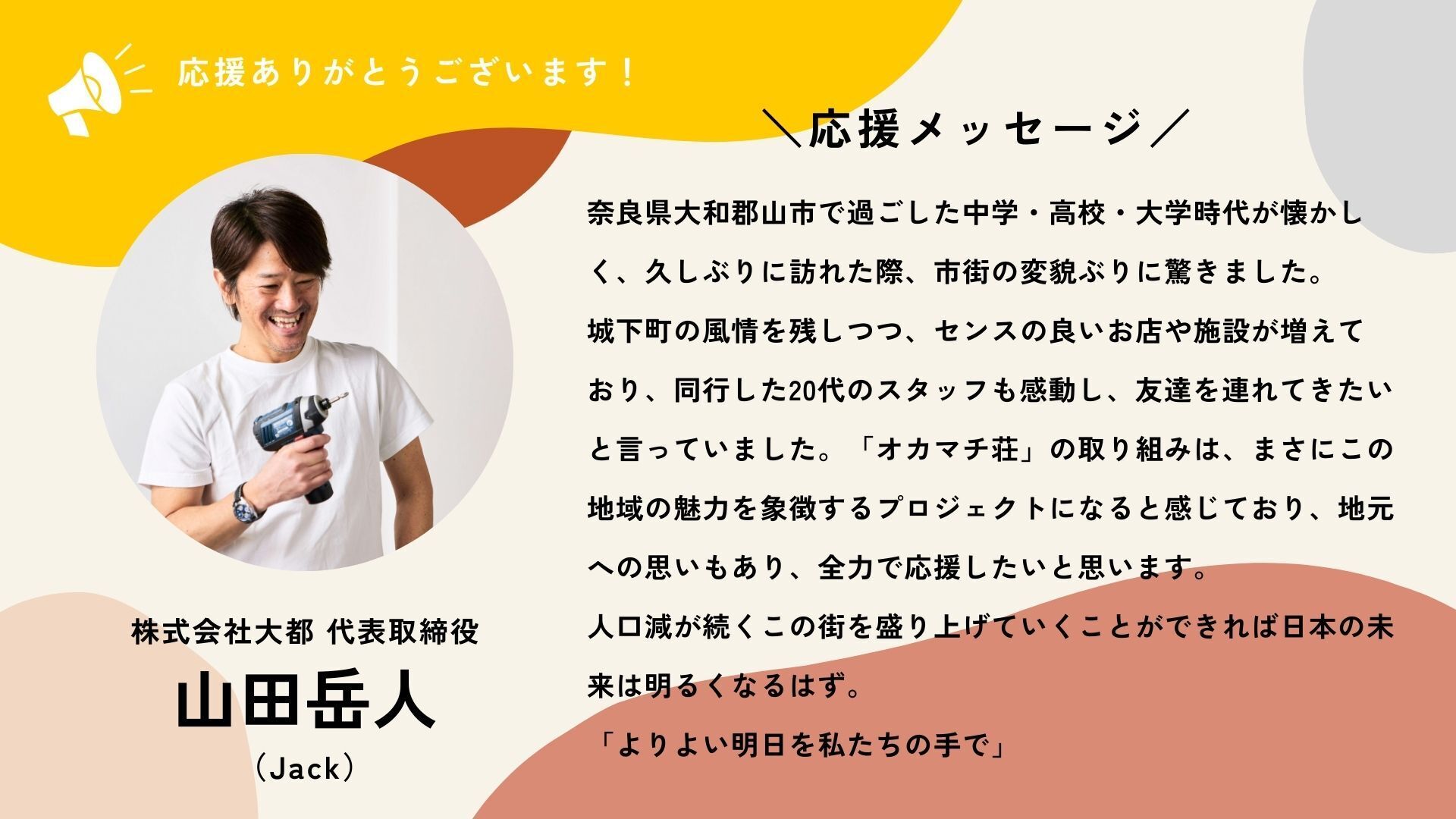 地元といえど10年近く離れており、地元のまちが商店街の衰退や空き家の増加に悩まされている現状を初めて知り、何か自分自身のスキルを活かす事はできないかと思い、リノベーションスクールで出会った方々とともに大和郡山まちづくり株式会社を立ち上げることとなりました。