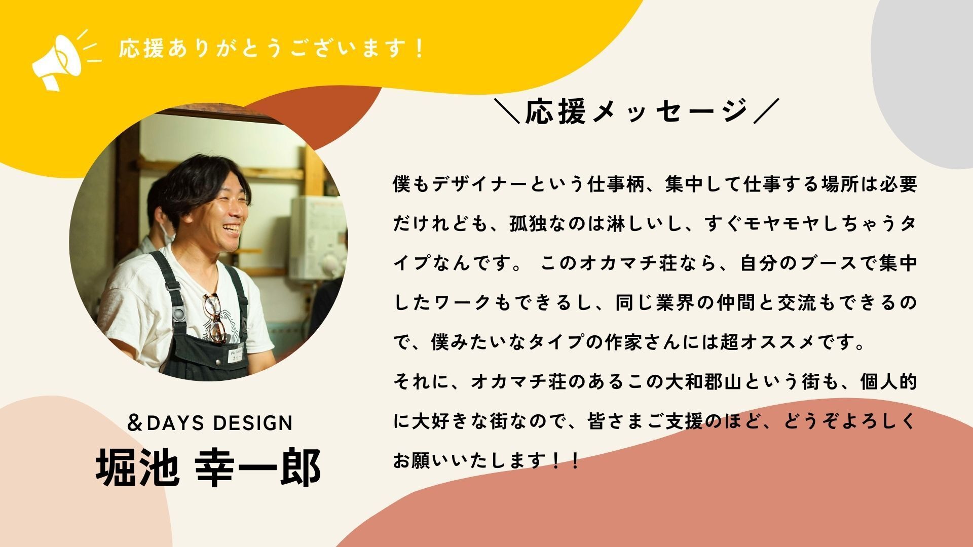 ご縁でオカマチ荘と出会い、デザイナー/フォトグラファーである私も参画を決めました。大学で芸術を専攻していたときに、友人と『シェアアトリエがあったらいいよね』と話していたことを思い出し、ここでその夢を実現したいと思っています!