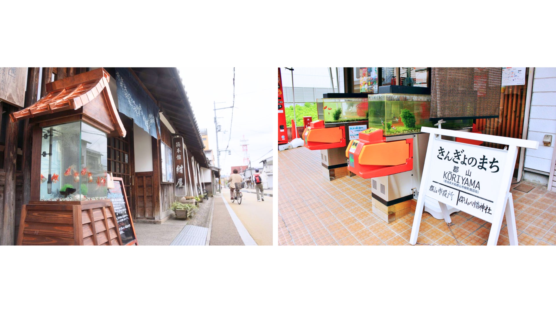 金魚の名産地として全国に知られ、「全国金魚すくい選手権大会」が毎年開催されているんです。電気屋さんの電子レンジのなかやテレビ、自販機、改札機、市役所の看板、マンホールの蓋、灰皿まで、まちの至る所に金魚が。