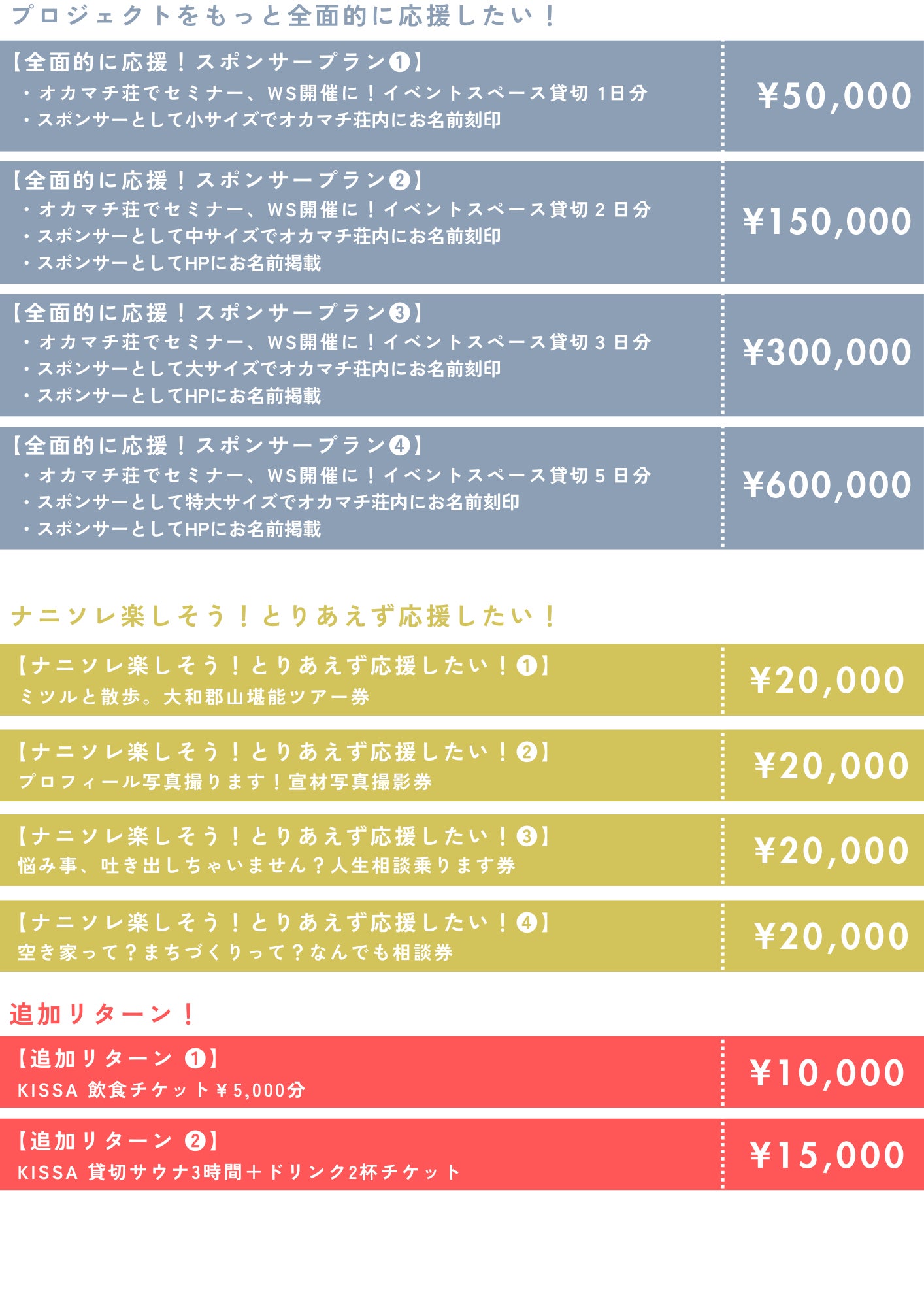 今回のプロジェクトでのリターン品は、興味を持ってくれた方も、オカマチ荘や大和郡山市になかなか来れない方も、これを期に大和郡山市やオカマチ荘との関わりが生まれることを期待してのラインナップとなっています!こちらに一覧となりますのでぜひご覧くださいませ!