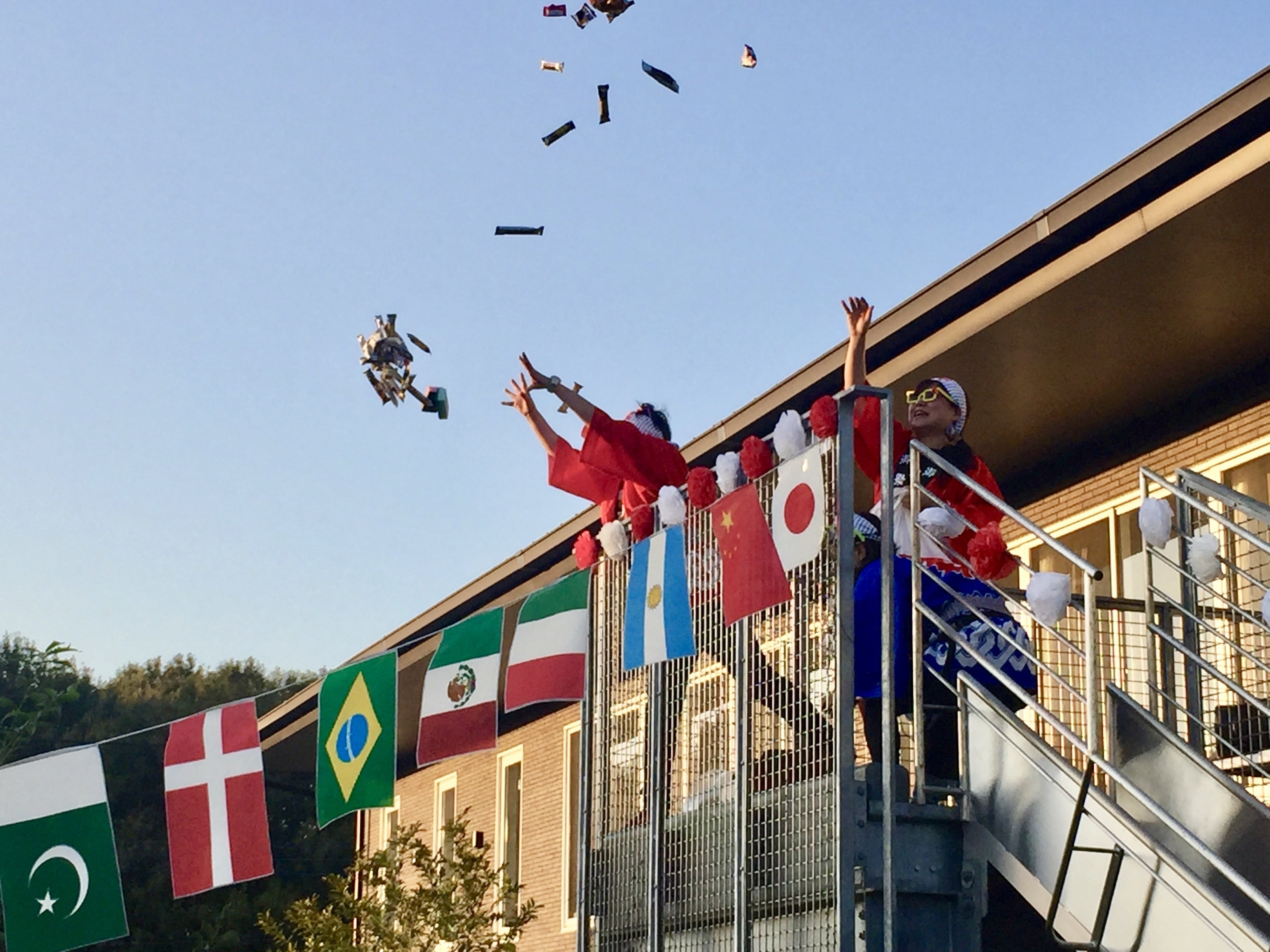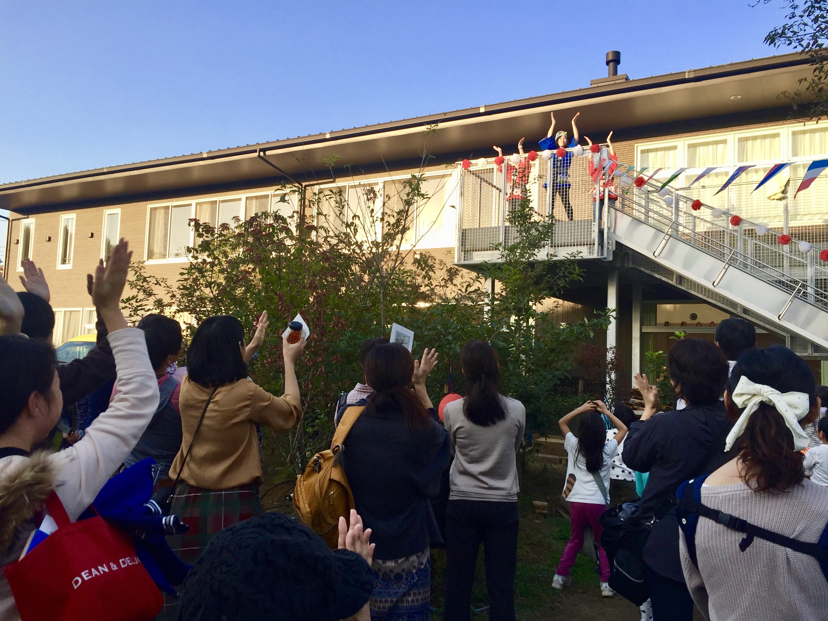 場所を変えてスクール2階、外階段踊り場からのお餅まきです!