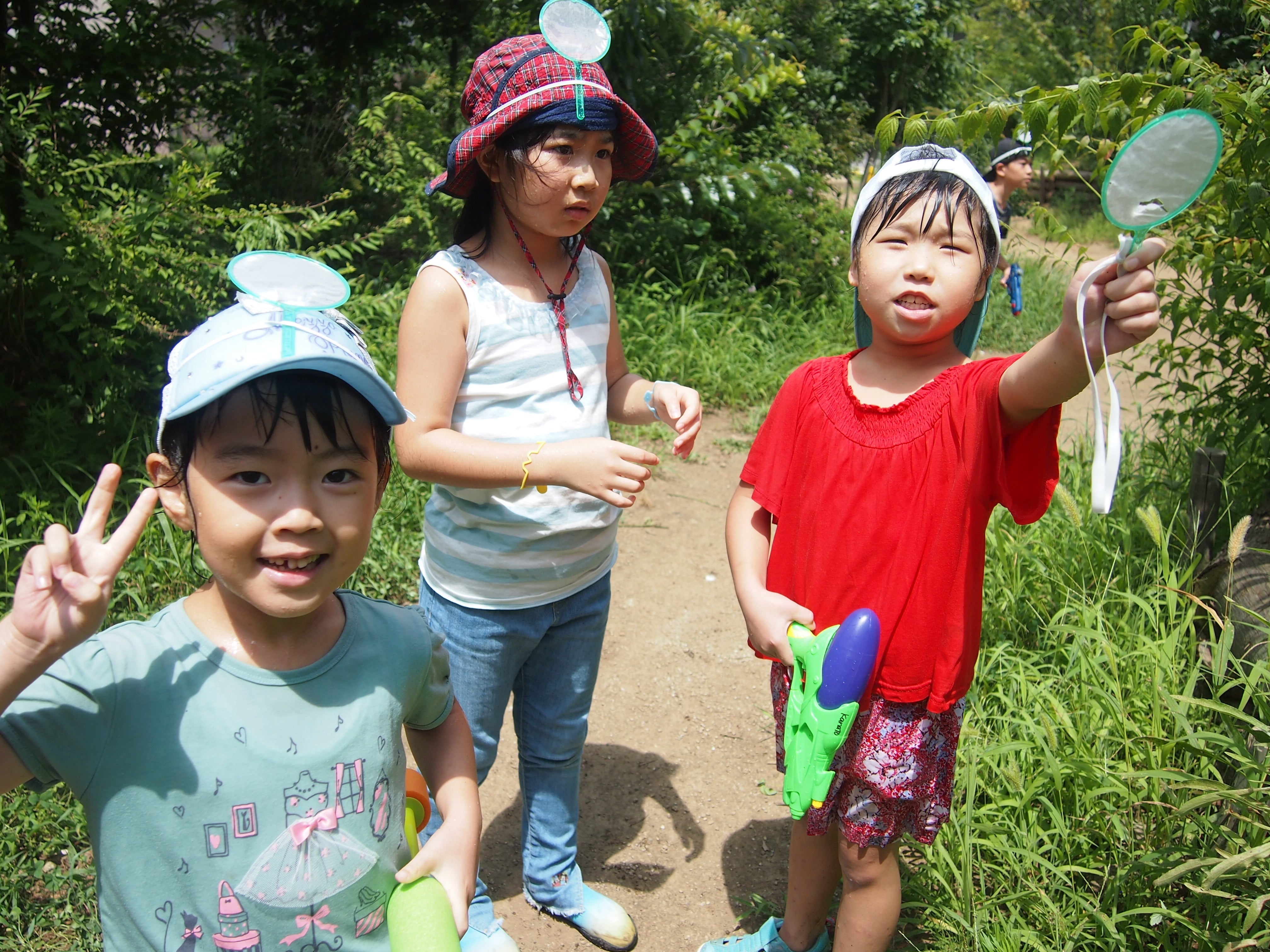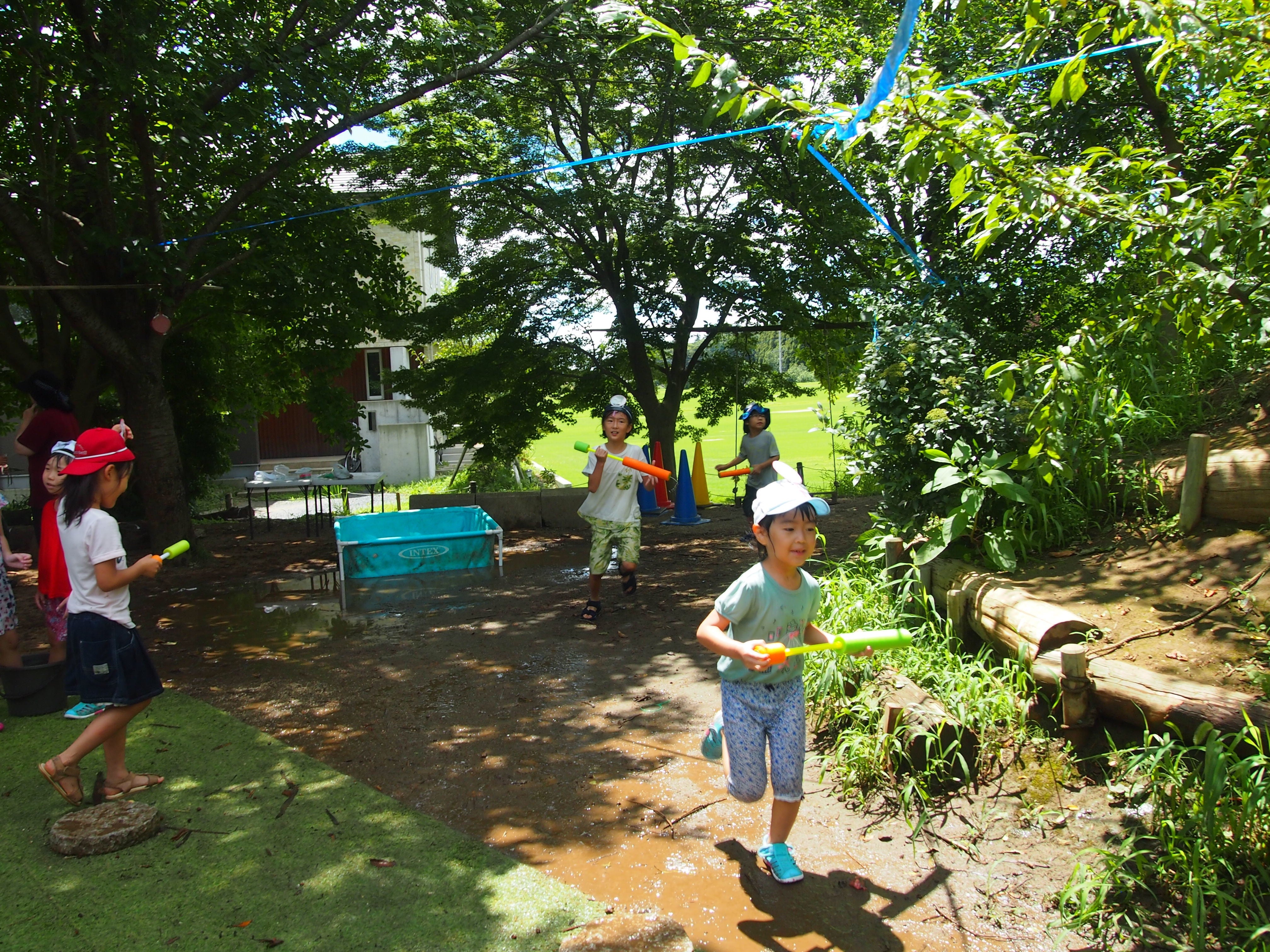 園庭の木々は緑深く、涼しげな木陰を作っています。その合間を水鉄砲を抱えた女の子たちが走ってきました!