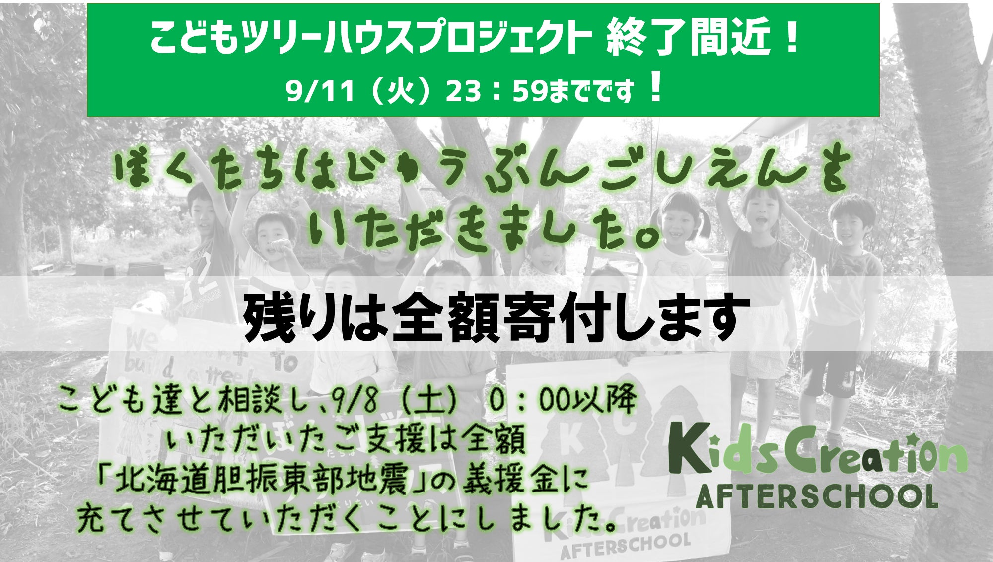 こどもたちは、心から北海道の皆様を応援しています。 何とかして自分にできることをしたい、と一生懸命考えてくれました。 みんなでポスターを描いて、大きな声で「がんばれー!」と声援を送りました! クラウドファンディングで集めた資金を、当初の目的ではなく 義援金に充てるという前例のないことを、前向きに検討し受け入れてくださった CAMPFIREのスタッフの皆様にも心から敬意を表します。 皆様のご支援をお待ちしています。 プロジェクトが終了し、支援額が確定しましたら速やかに寄付を実行します。 そして、必ず活動報告で皆様にご報告いたします。 多くの皆様からのご支援をお待ちしています。