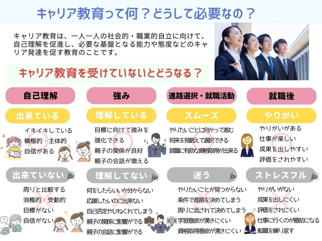 進路選択時に自己理解、仕事理解が不十分なまま進学や就職をする人が多いと思います。義務教育では周りと同じように行動する行動規範などを習得する為、社会性は身に付くものの、逆に言うと個性の確立が阻害されることもあり、特に中学生は発達心理的にもアイデンティティが確立したばかりの為、自己理解が十分でない内に進路選択を迎えています。また職業に触れる経験が少なく仕事理解が不十分の為、選択肢が狭いと考えられます。また保護者の見解や思い込みによる職業選択への影響が大きく子どもの進みたい道を誘導されたり、阻止されることもあります。そのことから本来行きたい方向を見失い、やりたいことが見つからず何となく就職してしまうと、就業先でのやりがいを見つけにくく、メンタル不調になるケースもあり、早期退職してしまうこともあるでしょう。その為、自己理解、仕事理解を深める機会を作りたいと考えております。また保護者にも本人と共にキャリア教育のワークを確認する中で、現在のお子様の適性に目を向けることが出来ると考えます。