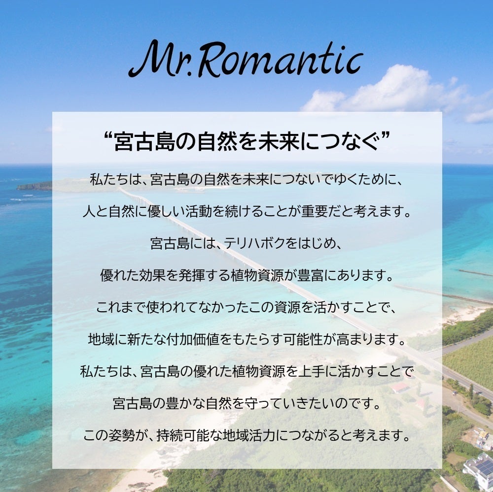 「Mr.Romantic」は、沖縄宮古島の地域資源を活かした商品を選んでいただくことで、経済循環を生み地域の持続可能性に寄与できると考えます。つまり、「Mr.Romantic」を選んでいただくことが、宮古島の美しい自然を未来につなぐ活動を後押しすることだと考えます。
