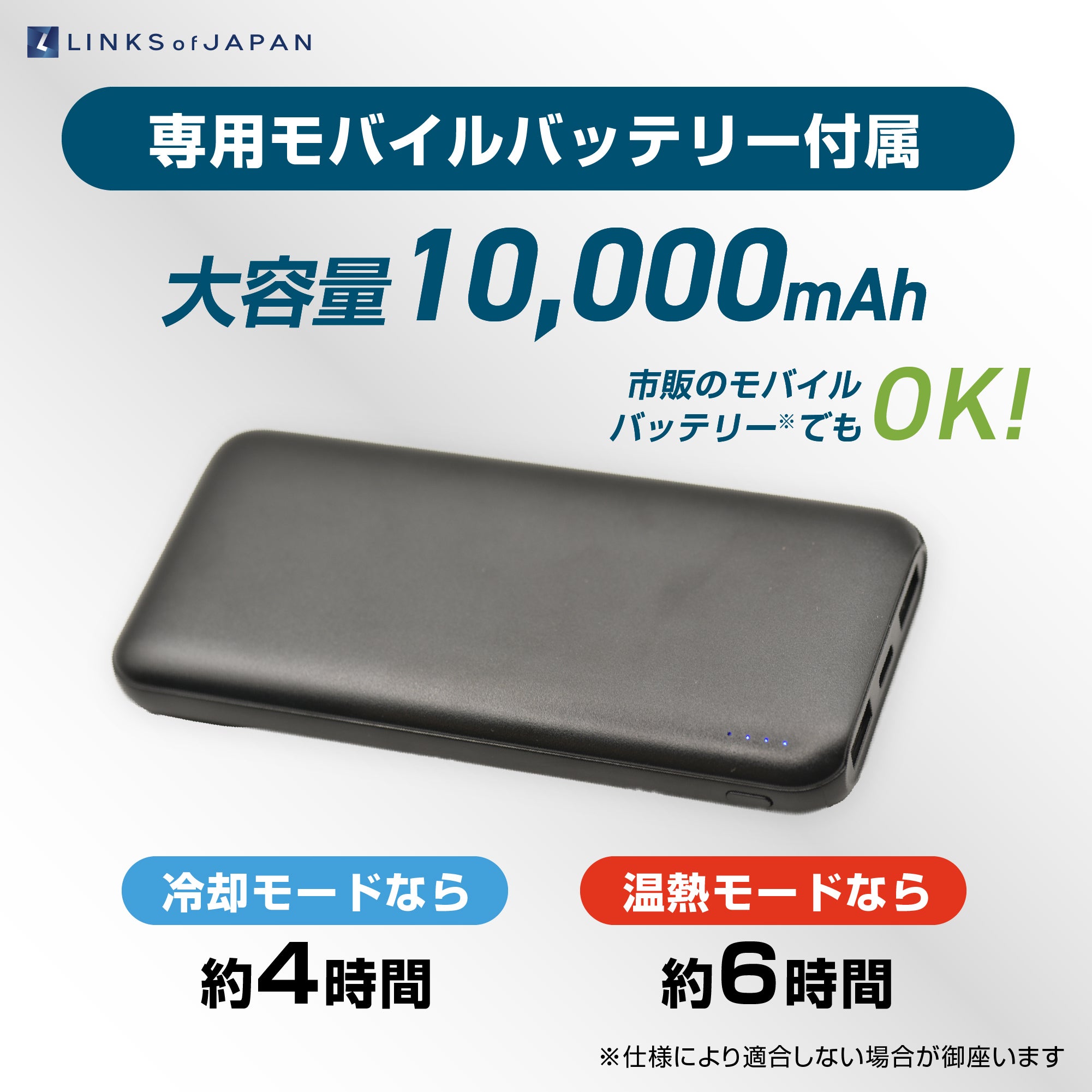 冷却モードで最大4時間使用できるモバイルバッテリーが付属しています。また、お手持ちのモバイルバッテリーも使用できる汎用性の高い設計です(モバイルバッテリーの仕様によっては使用できない場合があります)。