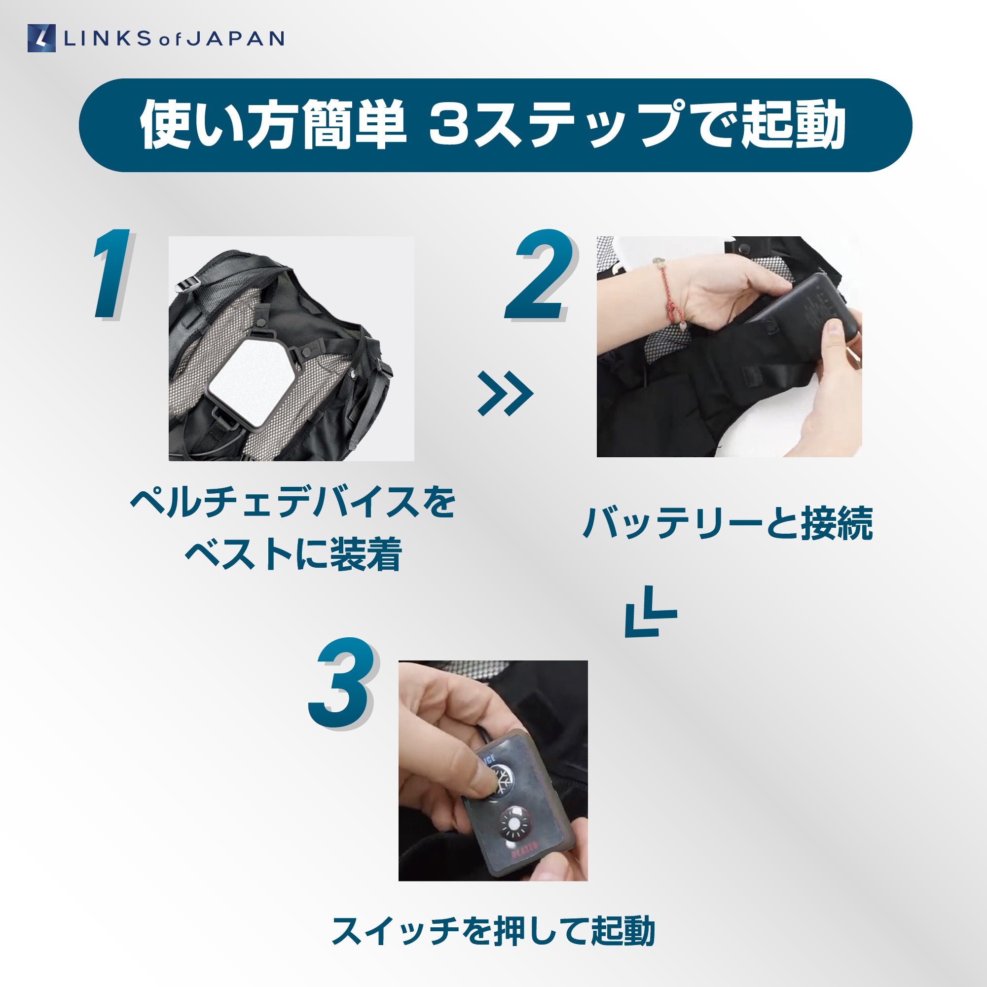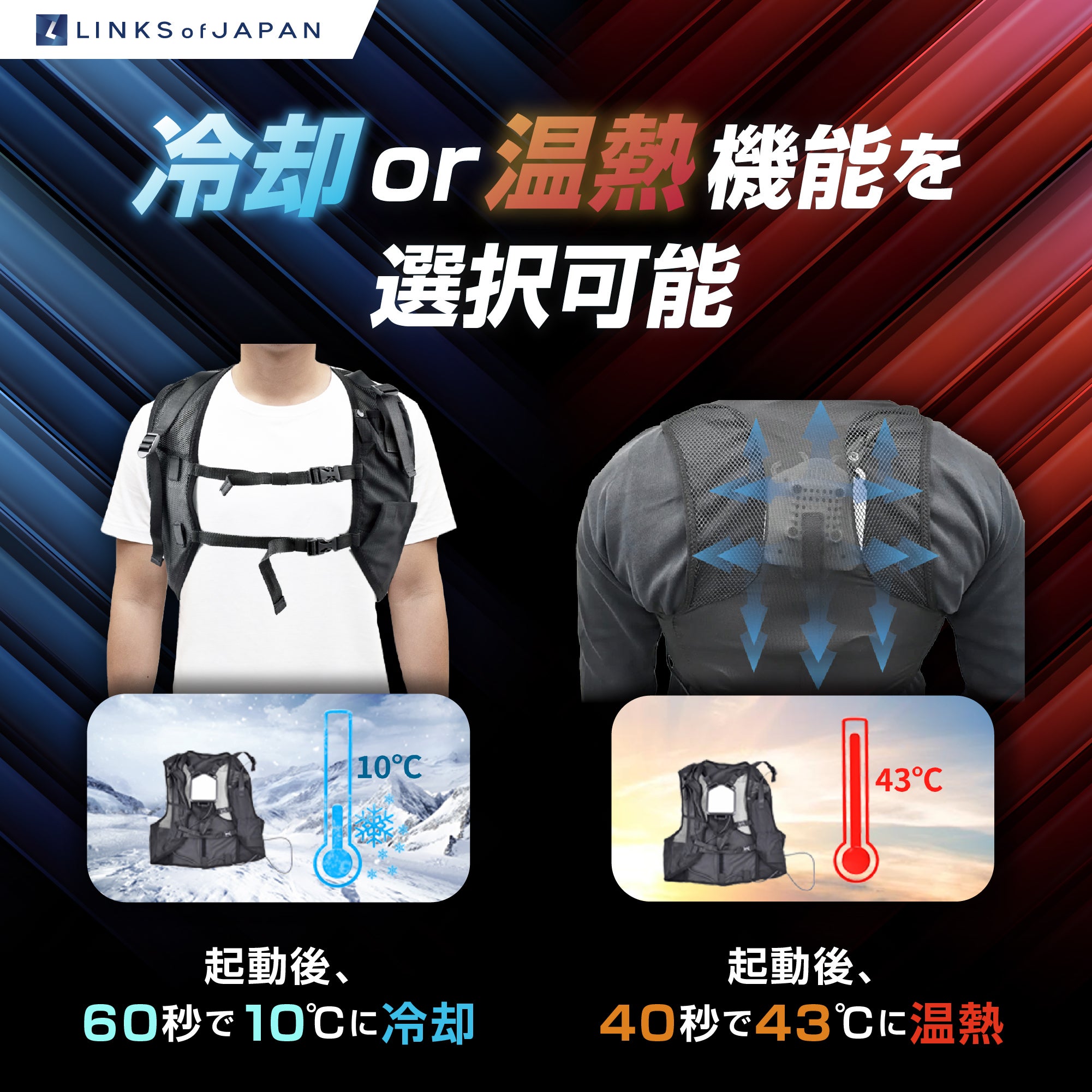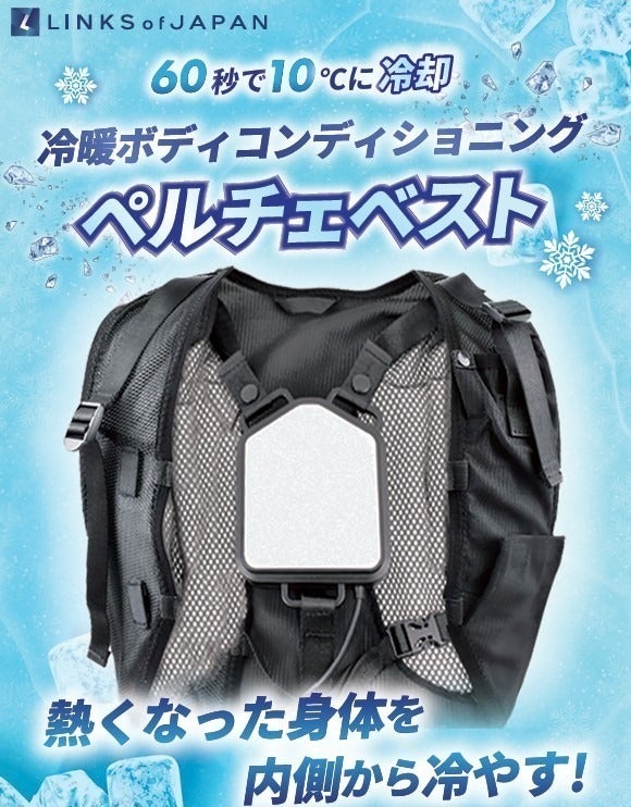 屋内外問わずあらゆる環境で体感温度を下げることができます。60秒でプレート温度が10℃*に到達し、背中の脊髄動脈を冷やすことで身体の内側から効果的に体感温度を下げます。*ペルチェプレートの表面温度となります