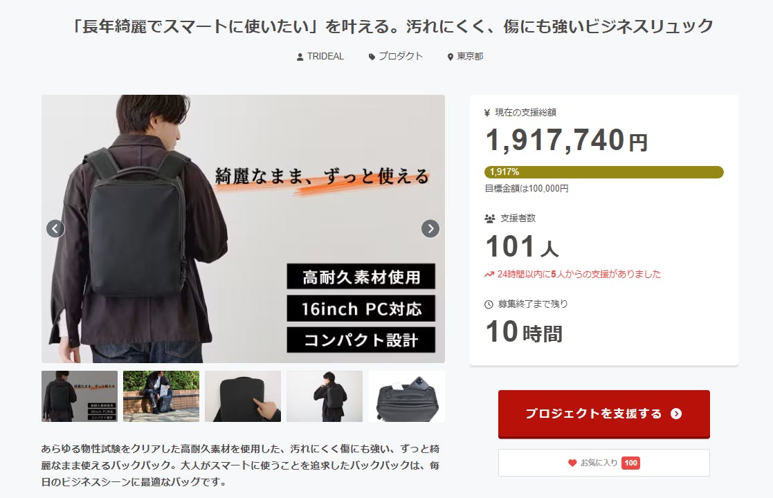 タフスリムバックパックは、machi-yaでのプロジェクト終了後に公式ストアやECモールでの一般販売を行います。