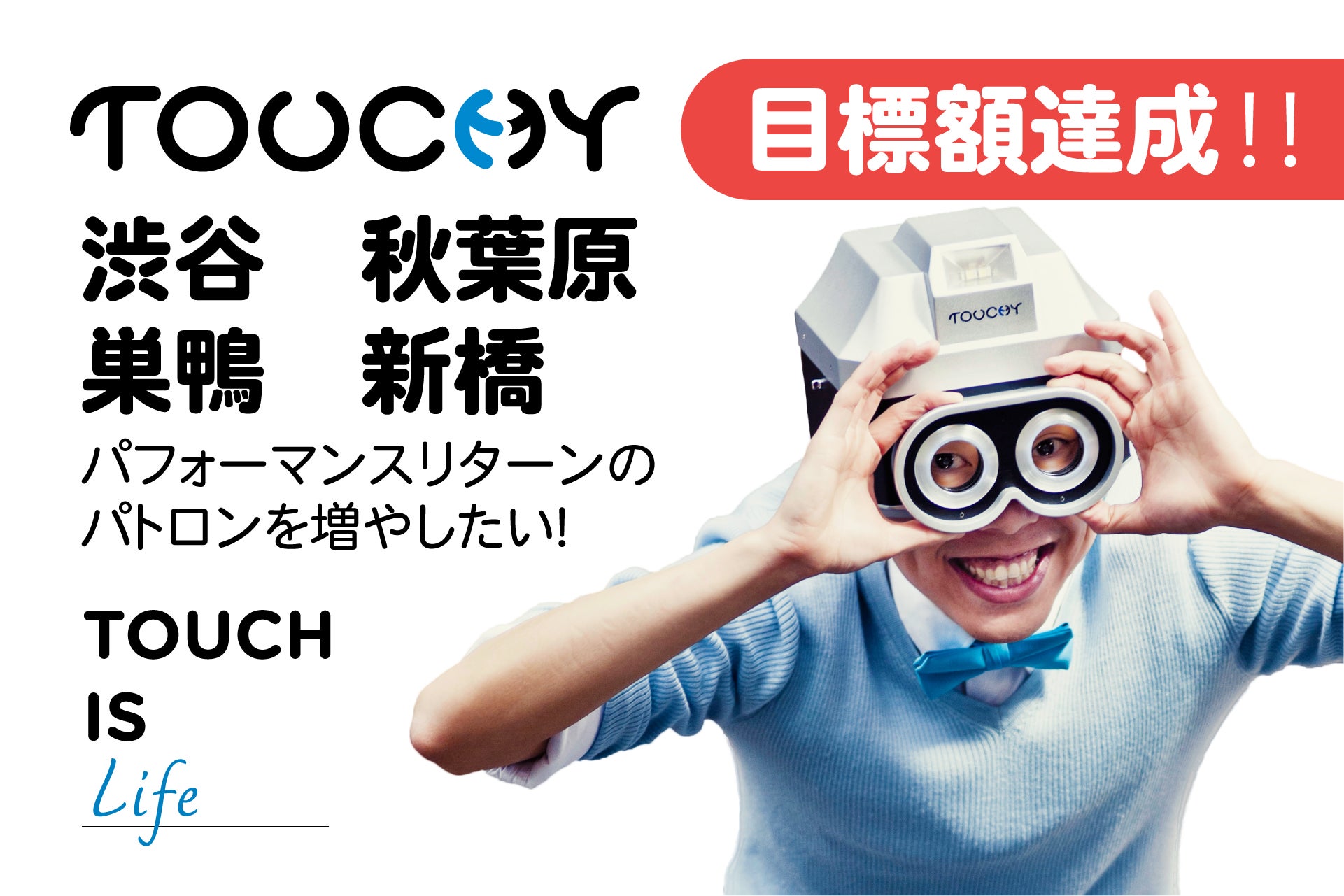 皆さんのサポート、本当にありがとうございます!! 達成度合いは100%を超えてはいますが、渋谷、秋葉原、巣鴨、そして新橋の4ヶ所でTOUCHYがパフォーマンスできるように、そしてドキュメンタリーを作れるように、引き続きパフォーマンスリターンのパトロンをなんとか増やしたい...!