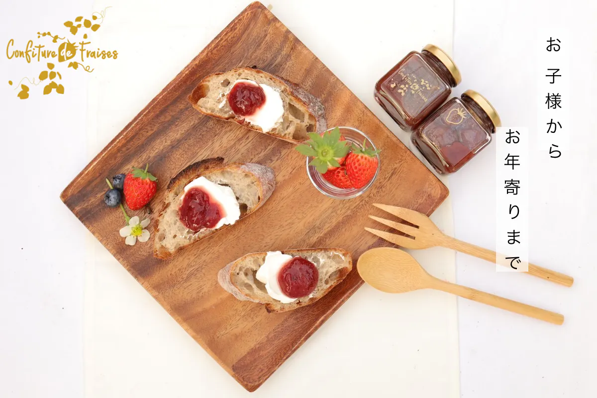 私たちのいちごコンフィチュールは、その自然な甘さと栄養価で、家族全員が安心して楽しめる一品です。