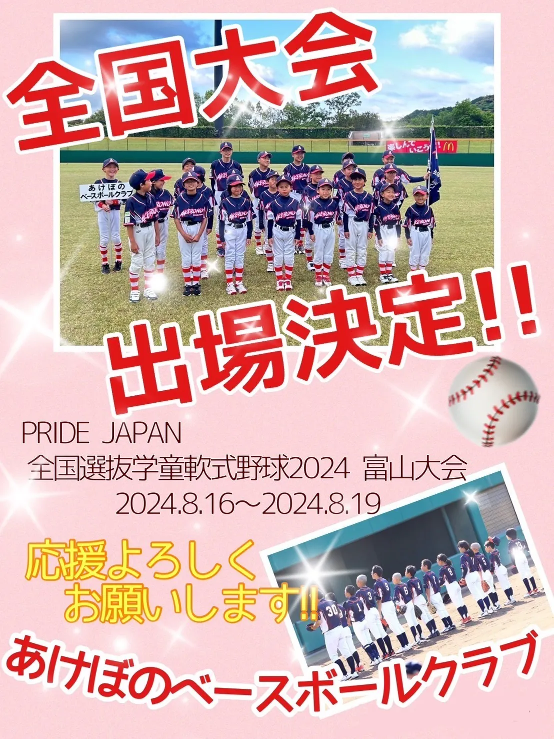 私たち、あけぼのベースボールクラブは、今年の8月16日から開催される、第3回PRIDEJAPAN全国選抜学童軟式野球大会2024富山大会に、山口県代表として出場させて頂くことになりました!