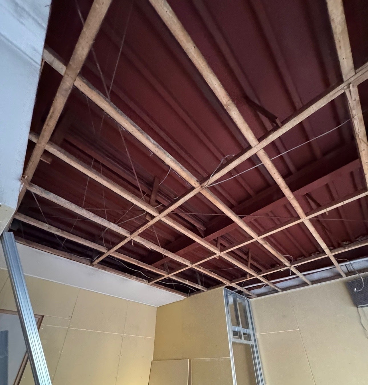 当初はフラットな天井にダウンライトを設置する予定でしたが、イメージを大きく変えて、鉄骨をむき出しにし、スポットライトを使うデザインに変更しました!