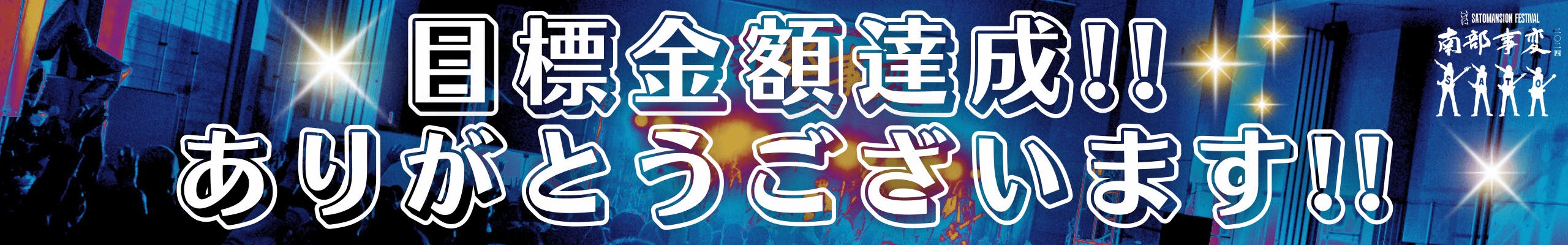 2024/10/03 13:15皆様のおかげで無事、目標金額に到達することが出来ました!本当にありがとうございます!本文に記載しているように、目標金額以上の使い道については次回の南部事変にも繋がるものにしたいと話し合った結果、今回のプロジェクトの最終地点でもある「九戸城」を舞台にした新曲のミュージックビデオ撮影の費用に使わせていただきたいと思います。目標金額は+50万円の「250万円」とさせていただきます。理想は来年の春、桜の季節です。もしまだ支援に迷われている方がいらっしゃいましたら、ぜひご協力お願いします!いただいた支援額はSaToMansion一同、責任を持って大切に使わせていただきます。残り数日間、引き続き宜しくお願いします!そして今年の南部事変2024で皆様とお会いできる事を楽しみにしております。SaToMansion佐藤幸城、佐藤英樹、佐藤和夫、佐藤伸之そして最終日の10/6(日)21:00〜(予定)メンバー全員で見守り生配信決定!!!!最終結果を一緒に見届けましょう!宜しくお願いします! もっと見る