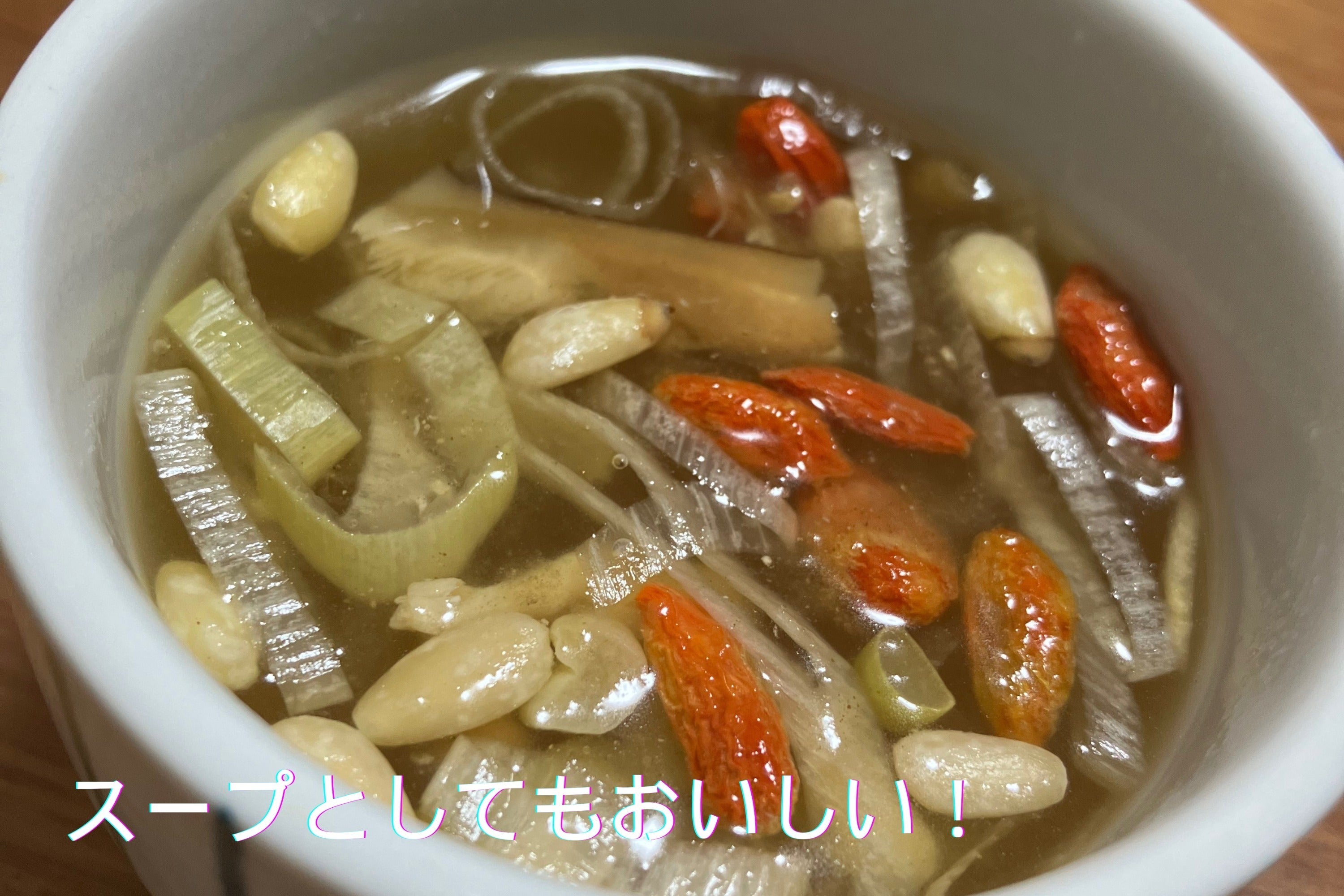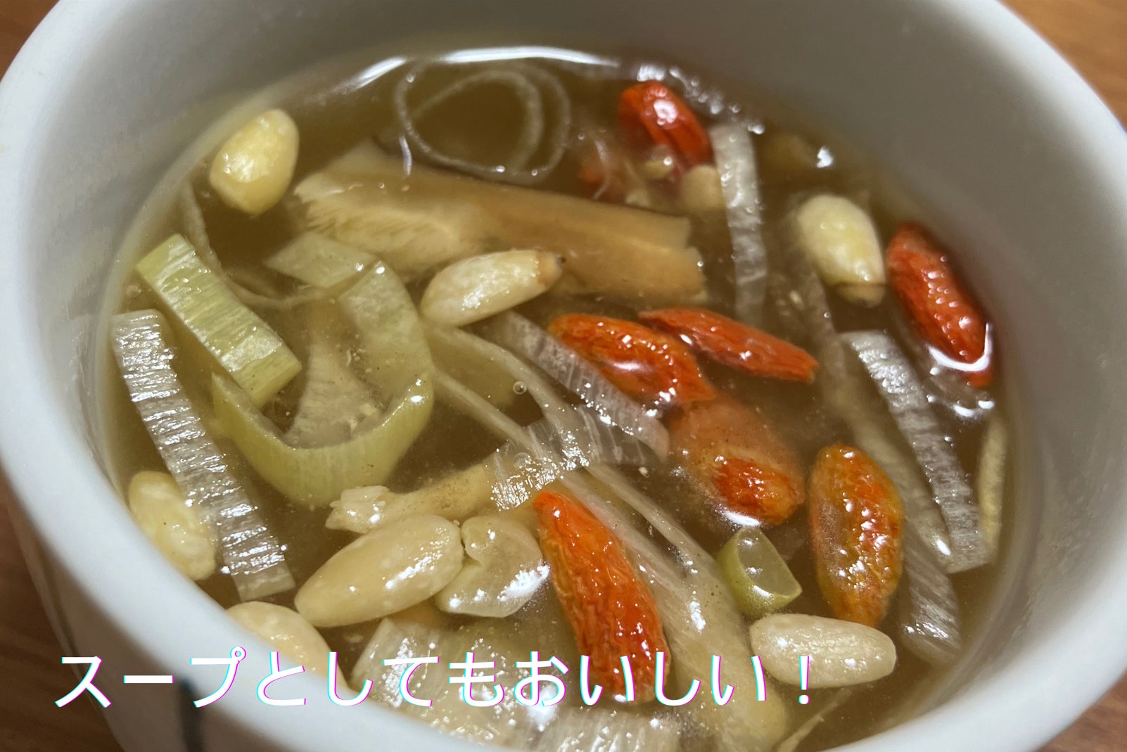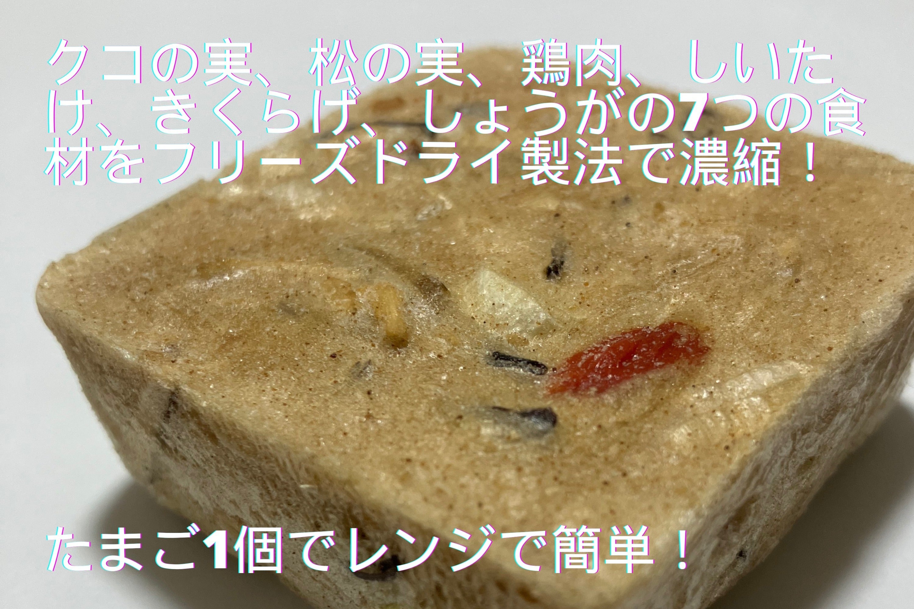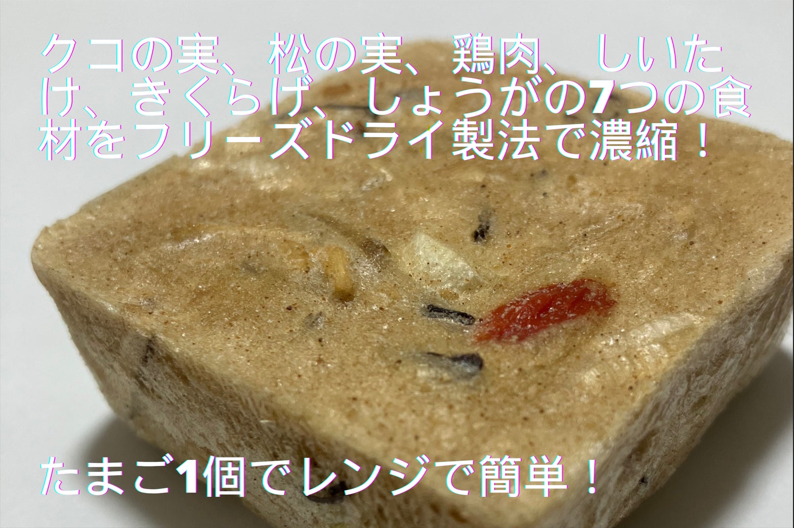 クコの実、松の実、鶏肉、白ねぎ、しいたけ、きくらげ、しょうがといった7つの食材を使用し、フリーズドライ製法で仕上げております。