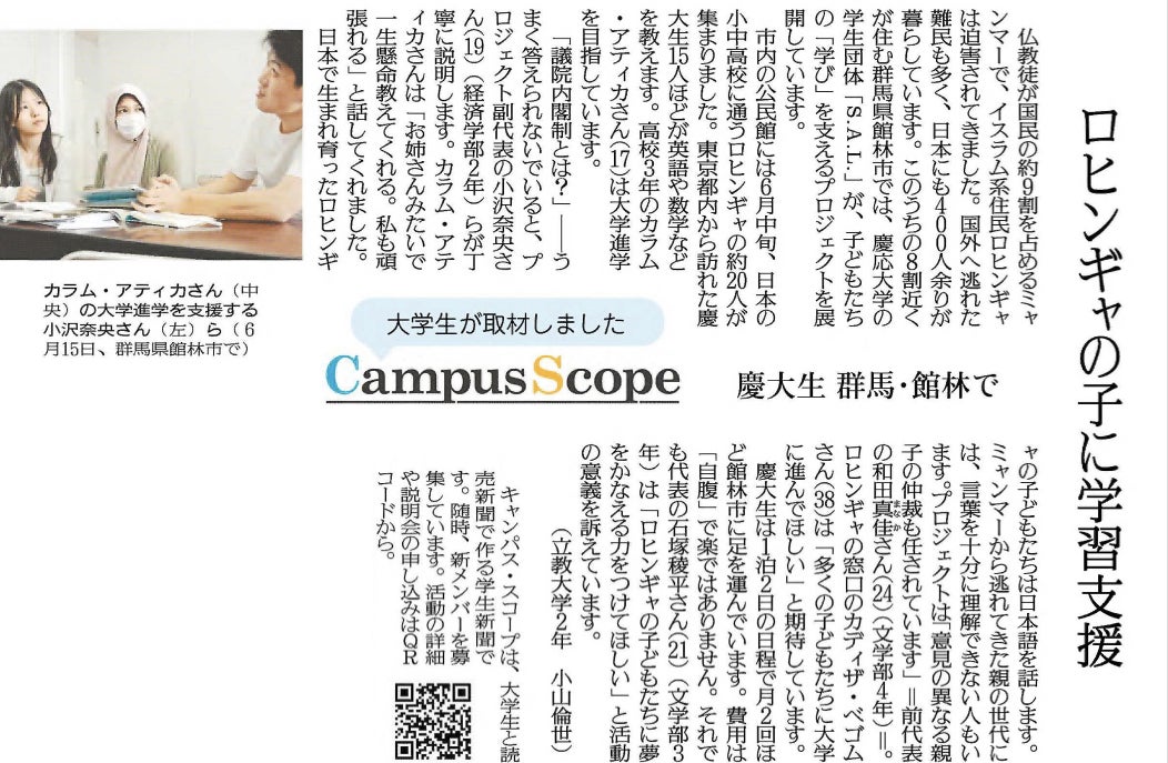 慶應義塾大学公認学生団体S.A.L.ロヒンギャプロジェクトは、宗教・言語上の理由でミャンマー政府から迫害され、群馬県館林市に避難してきたロヒンギャ難民の方々に対して支援を行なっています。日本を拠点とするロヒンギャ活動家のカディザ・ベゴム氏との連携のもと、経済的理由で教育環境が充実していない子どもへの受験支援活動のみならず、スポーツを中心としたレクリエーションや、今後のキャリアを具体的にイメージできるようにすることを目的とした企業・社会科見学、学祭への出店による広報活動、出張ワークショップや大阪・関西万博への出展準備などを行なっています。