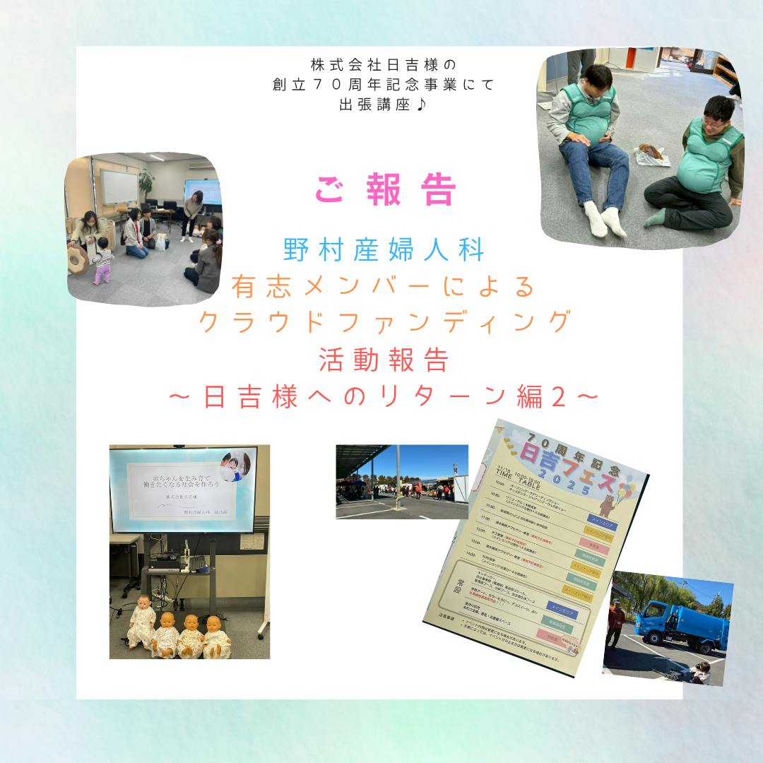 2025/12/28 11:47先日日吉様70周年記念事業にお招きいただき、クラウドファンディングのリターン講座『赤ちゃんを生み育て 働きたくなる社会を作ろう!』を開催しましたご参加くださった皆さま、本当にありがとうございました。今回の講座では、・少子高齢化の現状~私たちに何ができるか~・胎児の脳の発達について・産後クライシスを予防するためにという内容をお伝えしました。質問・相談タイムでは、妊婦ジャケット体験や赤ちゃん人形に触れていただきました。アットホームな日吉の社員の皆様♪とても熱心に参加して下さりました☺講座は日吉フェス2025と同時開催で、会場全体がにぎやかで、笑顔があふれる素敵な空間に包まれていましたクラウドファンディングで応援してくださった皆さまのおかげで、この学びの場をつくることができました。心より感謝申し上げます。これからも、妊娠・出産・子育てを社会全体で支えていけるよう、少しでも力になる活動を続けていきます日吉様、そしてご参加者の皆さま、ありがとうございました。 もっと見る