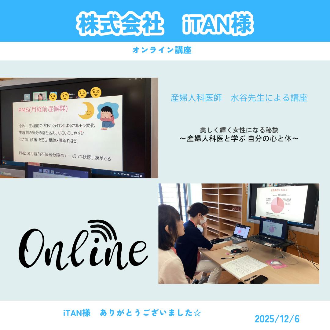 2025/12/28 11:50クラウドファンディングに寄付を頂いたiTAN様のリターンとして実現したオンライン講座のご報告♪株式会社iTANは東京にあり、スマホアプリ開発プラットフォーム『iSIN』の提供やDX支援を地域企業を中心に展開するIT企業です。今回支援いただいたことで、東京と滋賀という離れた場所でありながらオンライン講座が実現できたこたに感謝申し上げます。そしてオンライン講座の講師は、医療法人真心会の南草津野村病院、野村産婦人科に勤務されています皆様お馴染みの水谷ひかり先生でした♪先生は医療現場だけでなく 女性の健康教育にも積極的に取り組まれれ、企業向けの「女性の健康講座」、高校・中学校での性教育、大学での講義など、多方面で活動され日々地域医療と教育の両面で活躍されています。そんな水谷先生からとてもわかりやすい講座を皆さまにお届けでき、皆さまからの好評もいただき大変充実した講座となりました☆今回の参加者数は50名以上♪改めてご支援いただいたⅰTAN様、ご参加いただいた皆様、関係者の皆様ありがとうございました もっと見る