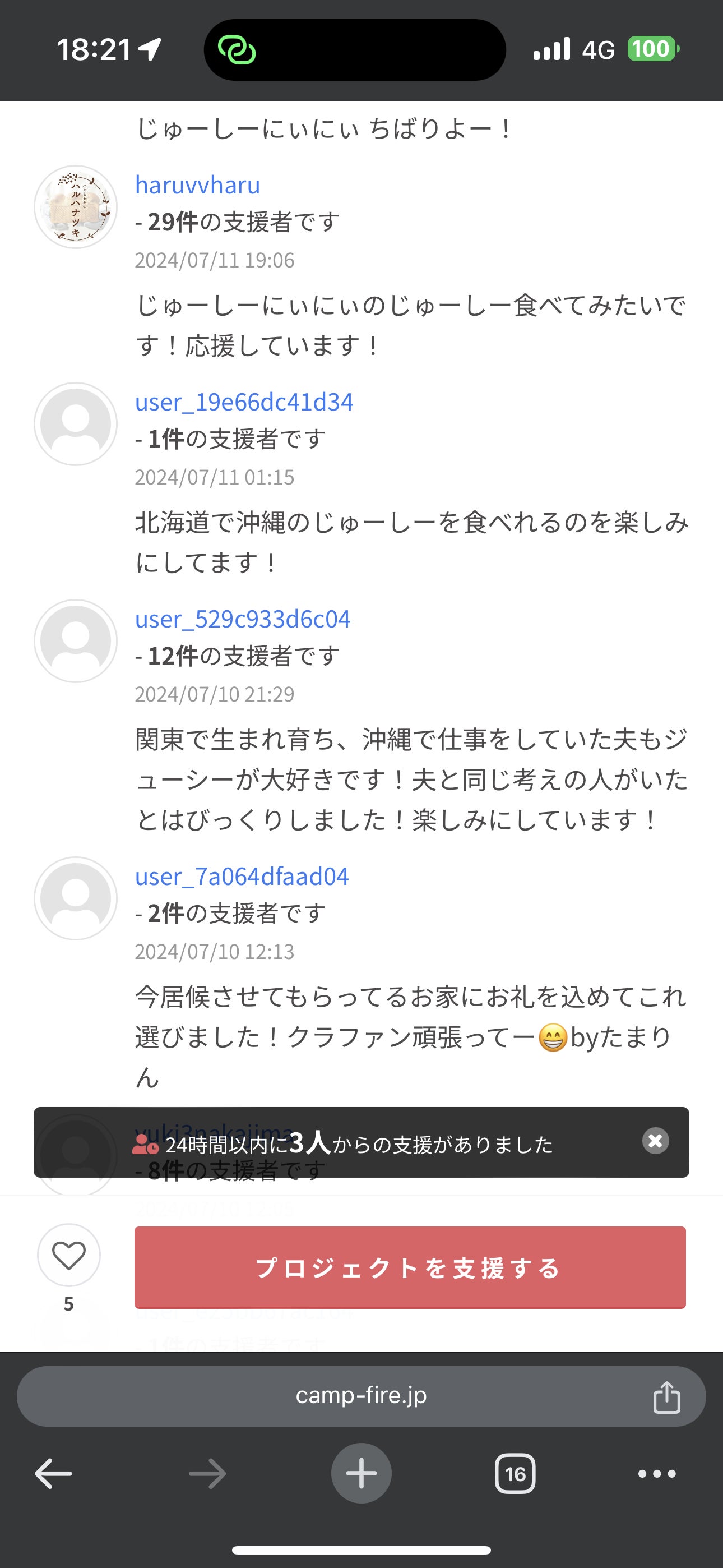 ご支援いただきありがとうございます!本日の朝に嘆きの投稿からご支援いただいている方が増えてきており、非常に感謝しております!!ぜひ、より多くの方にじゅーしーの素を食べていただきたいです!リターンは3,000円から可能ですので、引き続きよろしくお願いします!!