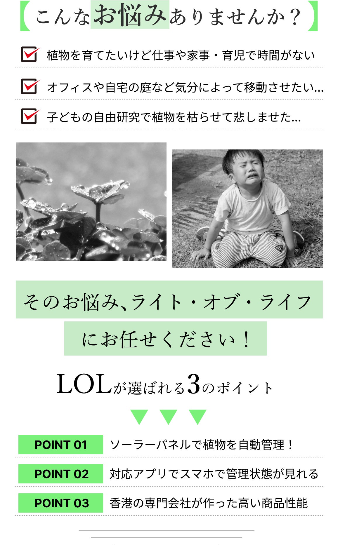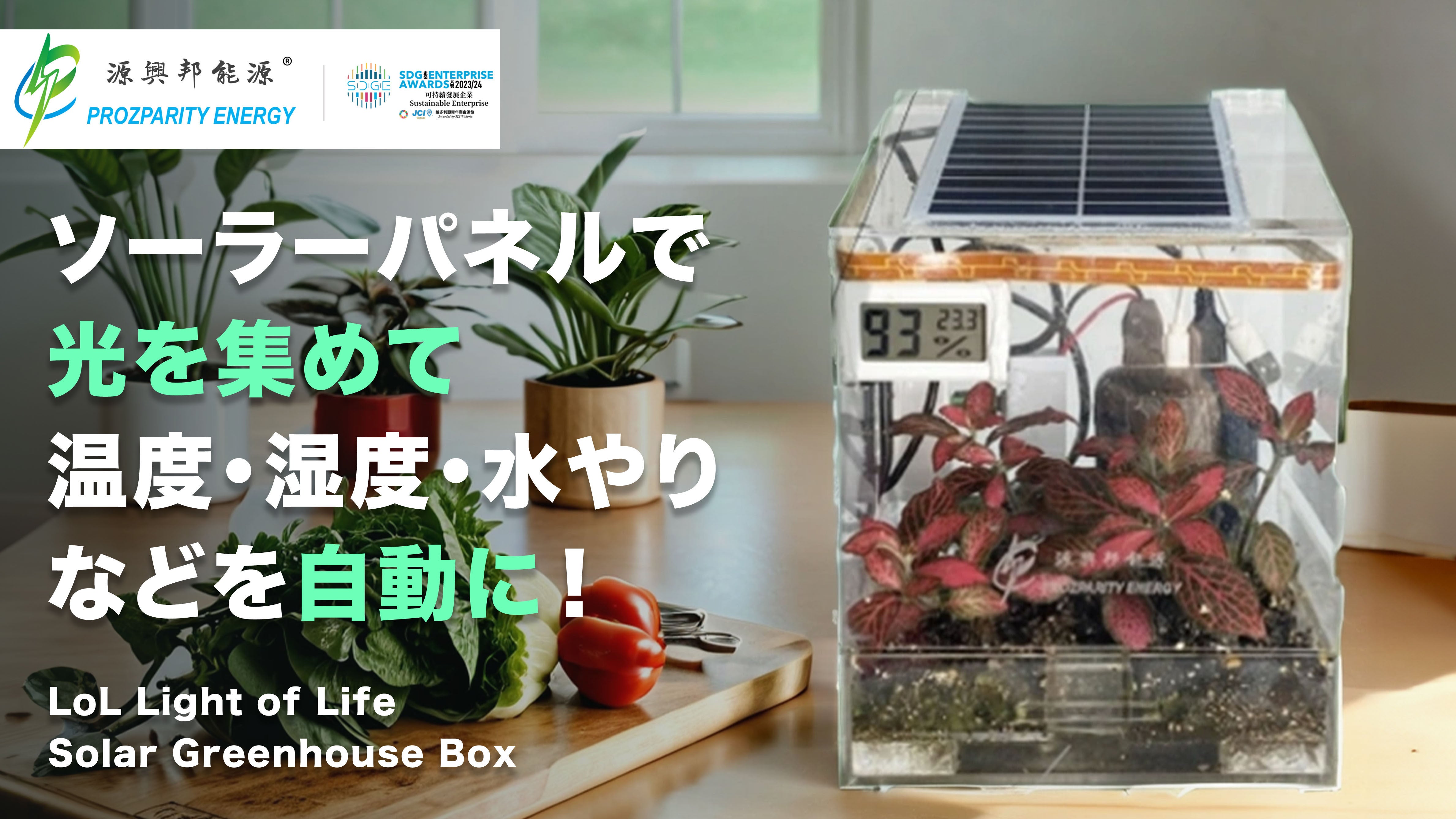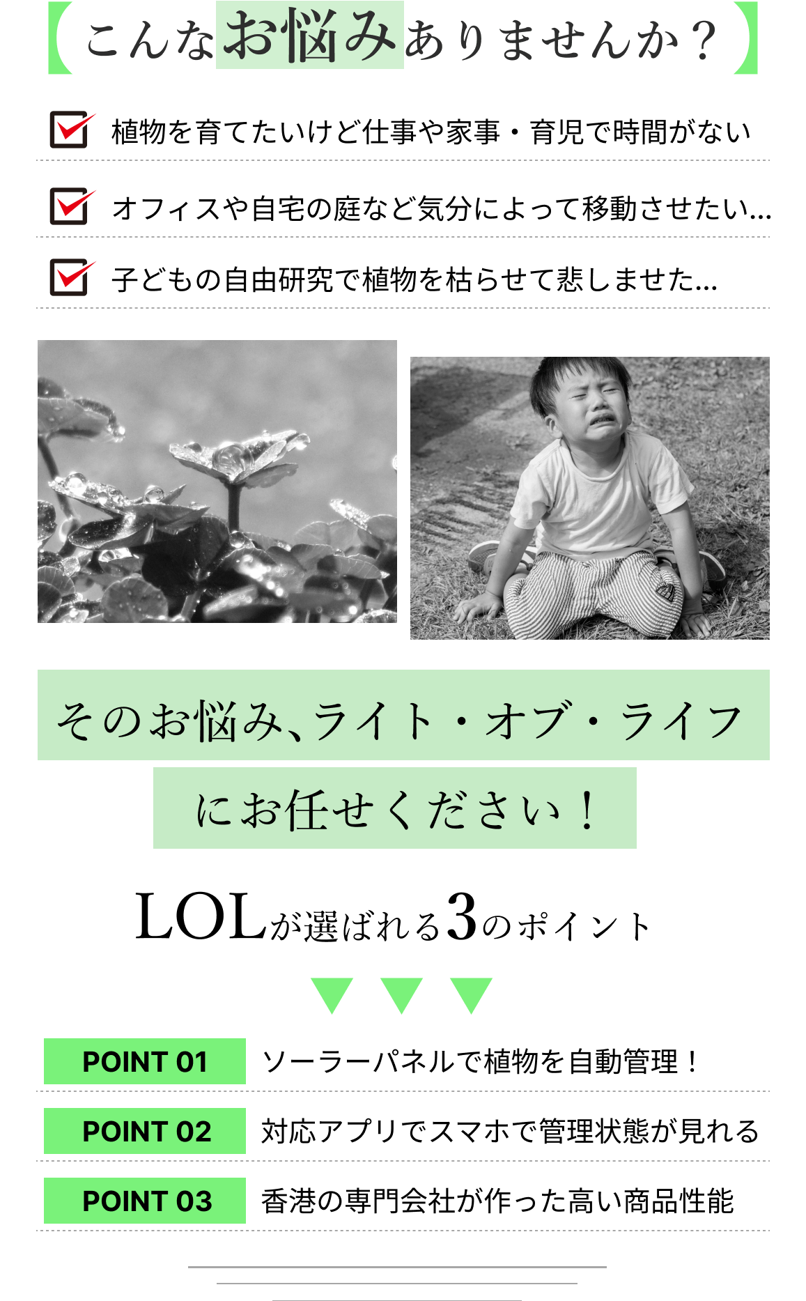 今回、私たちの主な事業の一つである太陽光発電と植物の関係性を見出し、太陽光のエネルギーで自動か植物の成長を楽しめる特許製品ライト・オブ・ライフ (LOL)を開発しました。