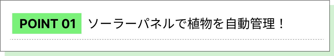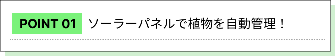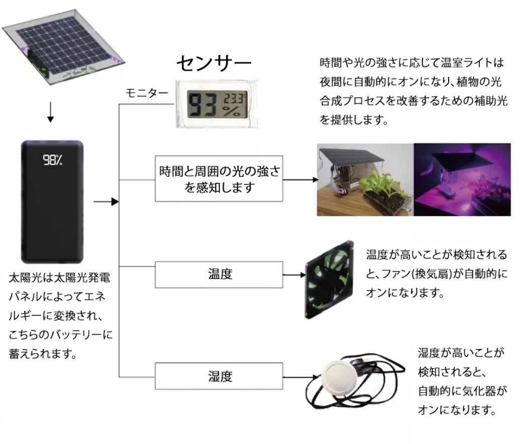 太陽光は太陽光発電パネル (ソーラーパネル) によってエネルギーに変換され、右側にある黒色のバッテリーに蓄えられます。そこから、温度制御・湿度コントロール・温室照明制御・簡単&低頻度の水やり・自動換気を自動で対応します。