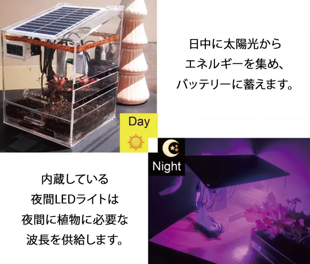 センサーが時間や太陽光の強さなどを感知し、自動で夜間LEDライトをオンにします。こちらの夜間LEDライトにより、夜間でも植物成長をサポートが可能になるため成長率もよりアップします。