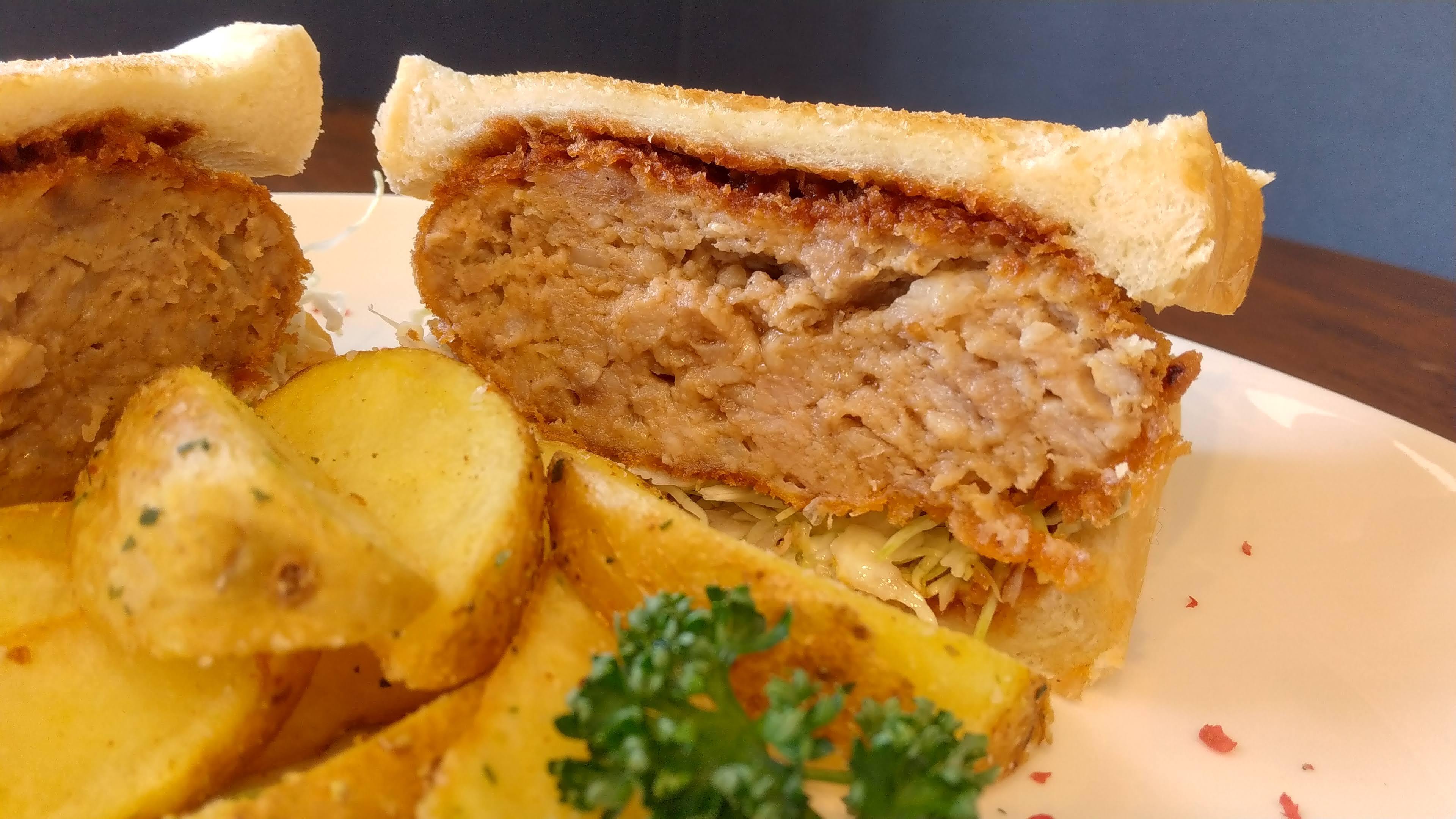 リピ続出!『郡司義一商店』の豚肉使用の当店名物 バカうまい!!!メンチカツサンド 厚さ約3.5cm