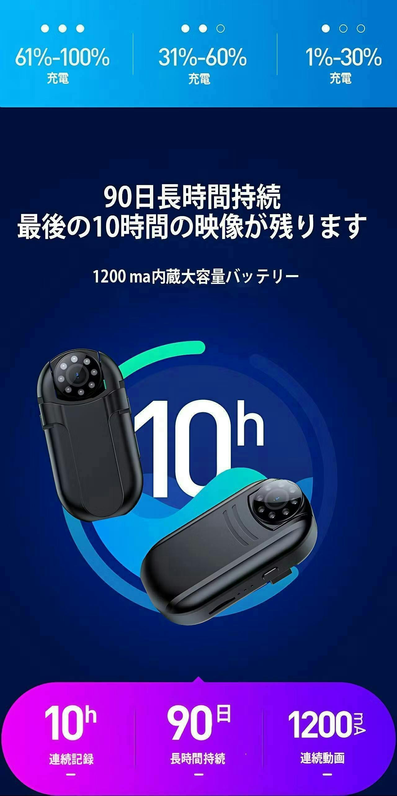 1200mAhの大容量のバッテリーを内蔵しているため10時間連続録画、電源が最大90日間持続可能です。