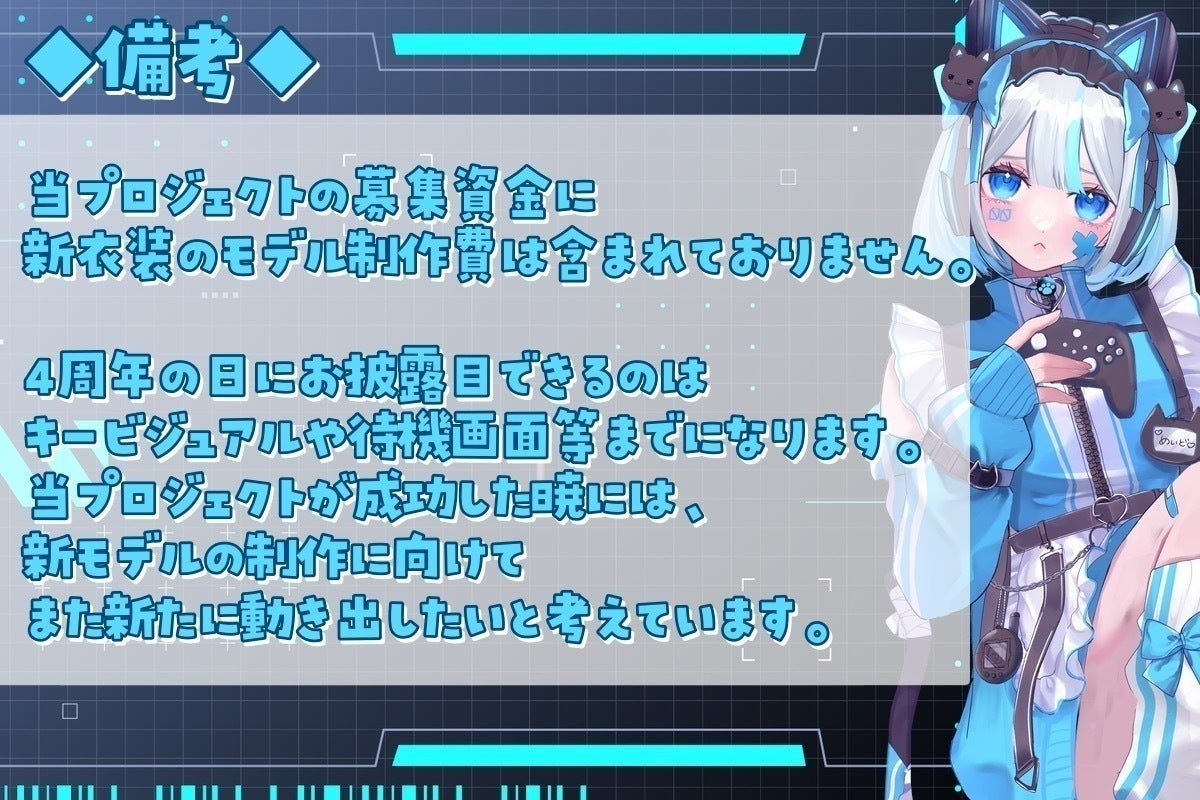 個人勢Vtuberとして活動を重ねていく上で赤字覚悟でいましたが、どうしても自分のやりたいことを金銭的理由で諦めるのが悔しく、今回初めてこのような形に挑戦します。せっかくの5年目を今よりバージョンアップした自分で活動したいと強く思っています。