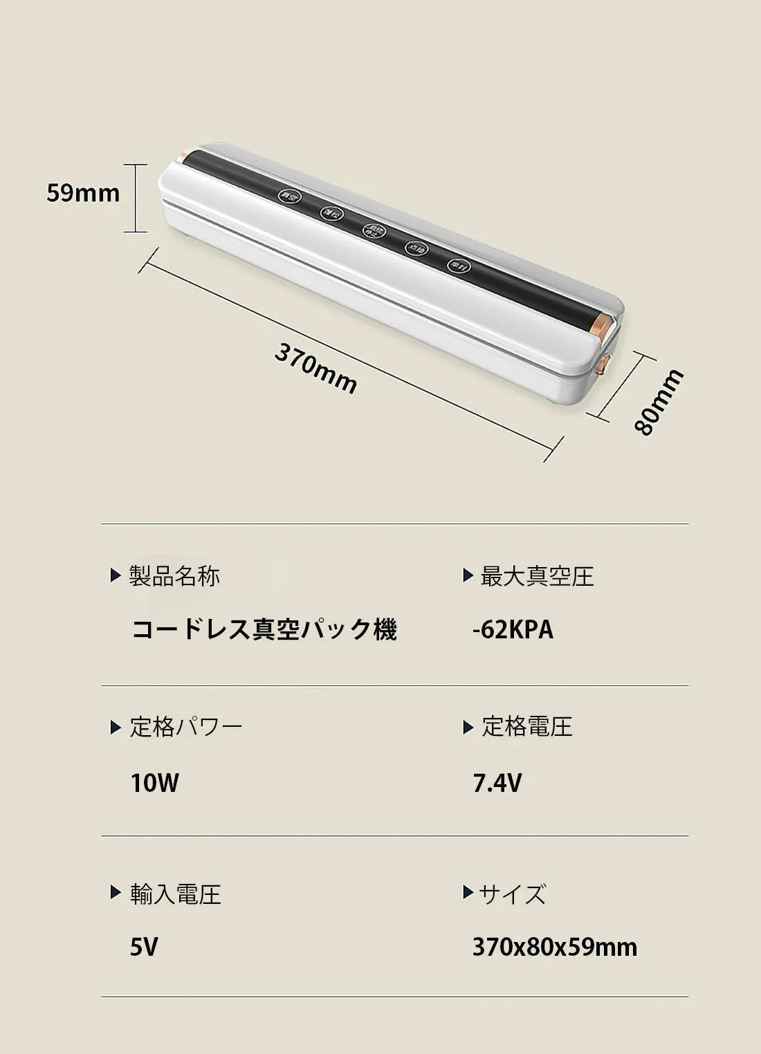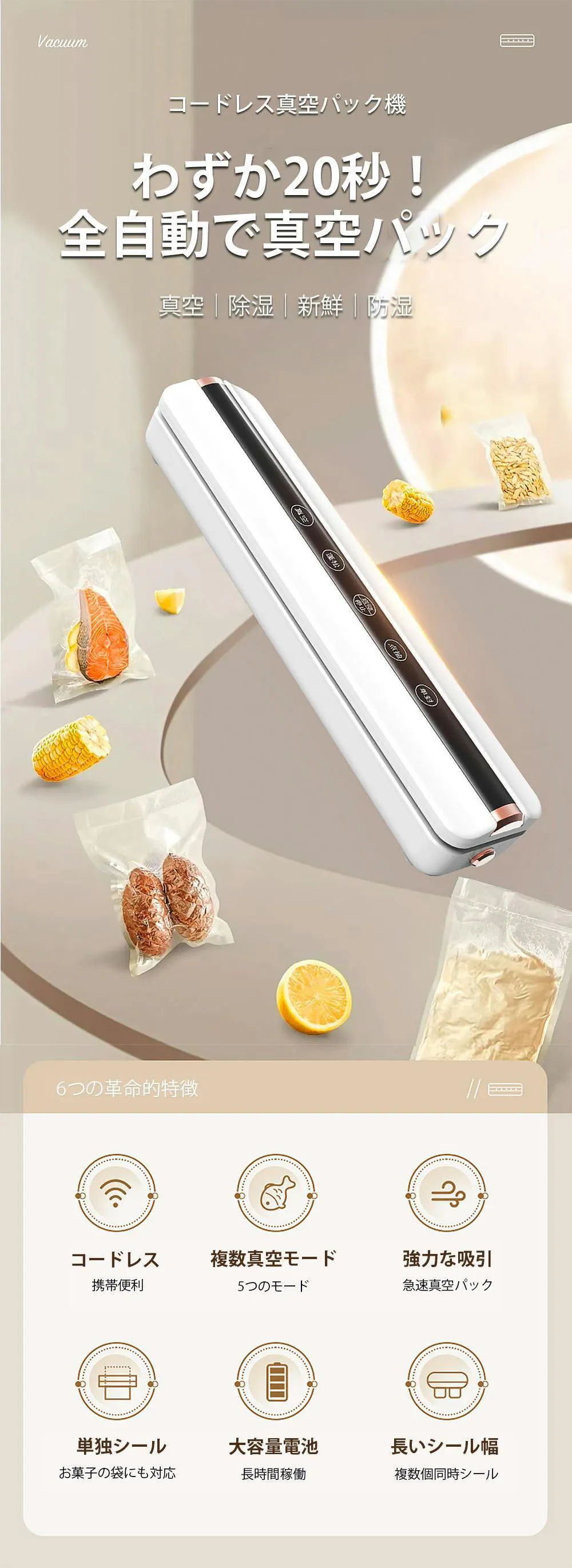 1500mAh大容量バッテリーが内蔵されており、フル充電で約50回、コードレスで真空パック機能を利用できます。