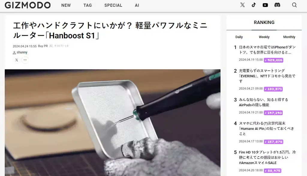 4月24日、 Gizmodoで「Hanboost S1 」を紹介して頂きました。