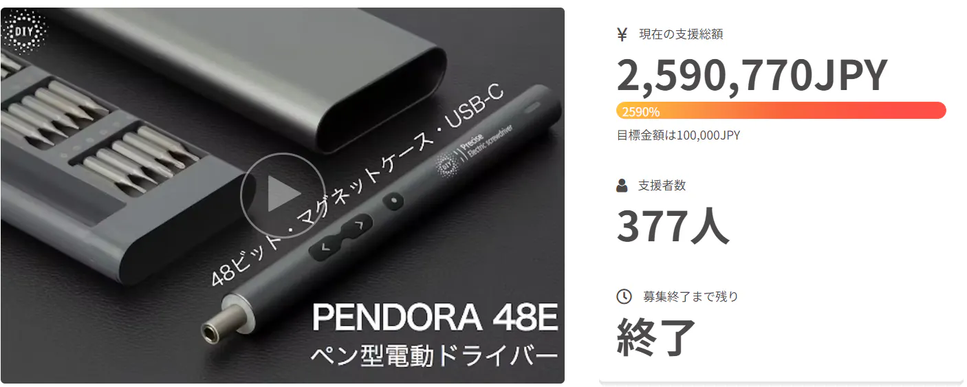 過去海外大手クラウドファンディングサイト海外クラウドファンディングで745名から、国内大手クラウドファンディングサイトでもPENDORA 48E/mini累計で約2000名よりご支援頂いております 電動ドライバーセット"PENDORA 48E"が、付属のビットを100本に増量し進化を遂げて帰ってきました!