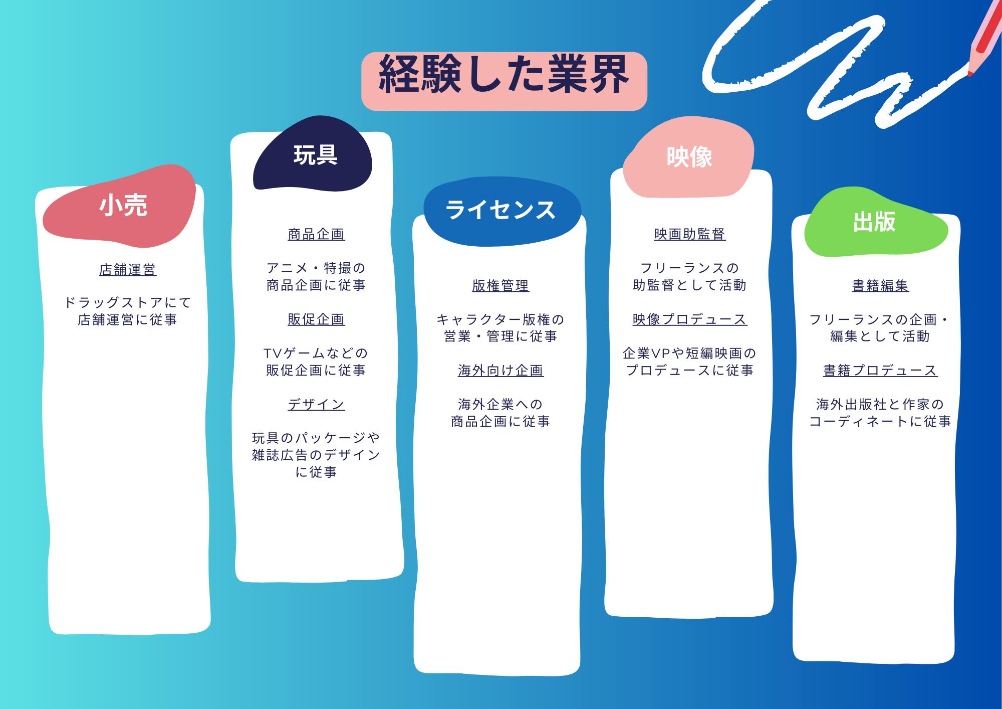 大学卒業後は、ドラッグストア、玩具、アート、アパレル業界を転々としながらも商品企画、進行管理、マネジメントなどのスキルを磨き、脱サラしました。フリーランスになってからは、映画、出版、飲食業界でプロデュース業を磨き、コンテンツ輸出業で起業をしましたが、コロナの影響で倒産。紆余曲折を経て、現職にたどり着きました。