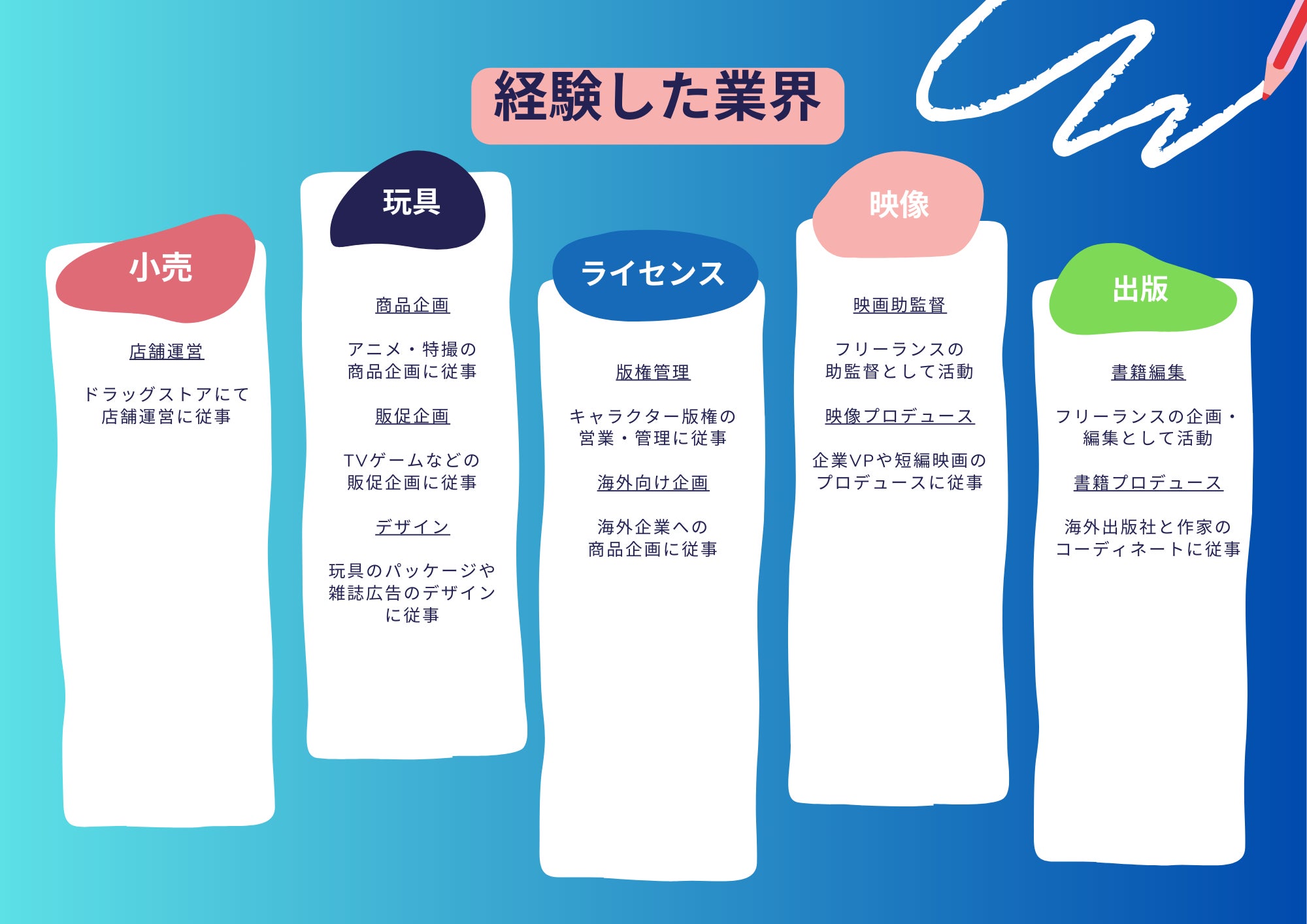 大学卒業後は、ドラッグストア、玩具、アート、アパレル業界を転々としながらも商品企画、進行管理、マネジメントなどのスキルを磨き、脱サラしました。フリーランスになってからは、映画、出版、飲食業界でプロデュース業を磨き、コンテンツ輸出業で起業をしましたが、コロナの影響で倒産。紆余曲折を経て、現職にたどり着きました。