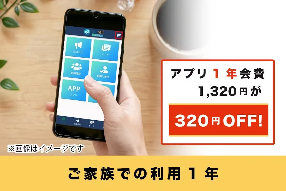 離れて暮らす親御様も含め、ご家族全員で見守り・安否確認アプリ「Metell LIFE(ミテルライフ)」を1年間ご利用いただけます。