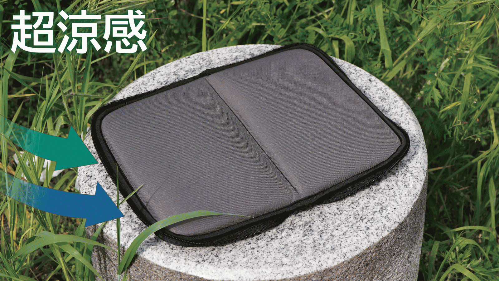 通気性に優れたメッシュクッションは接触冷感生地を採用し屋外でも涼やかに座れる超軽量型折り畳み式を実現!