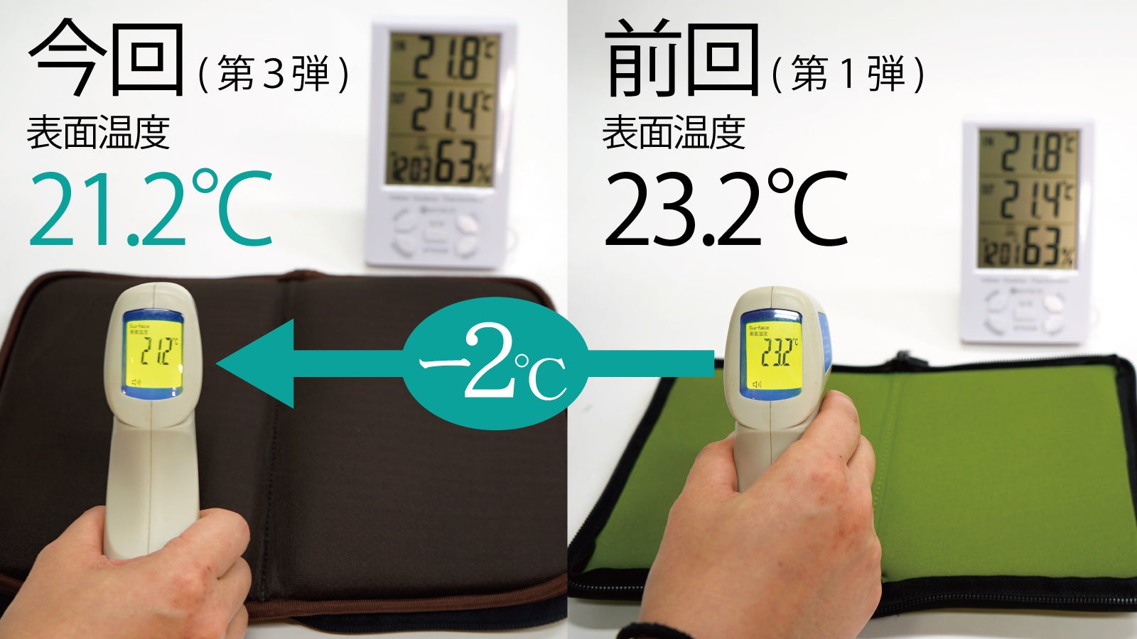 当社の従来品と比べて、表面温度はマイナス2度とひんやりとしています。