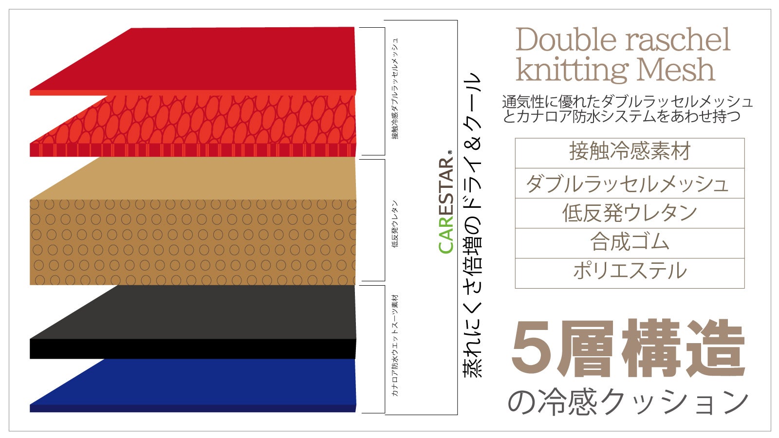 CARESTAR独自設計でダブルラッセルメッシュ+接触冷感生地を使用し