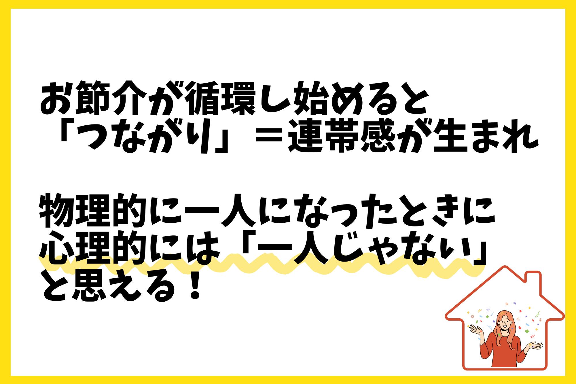 生み出したいのは、お節介の循環です。「助けてもらう」「助けてあげる」どちらの立場も経験していくコミュニティです。仕組みや効果は以下の通りです。