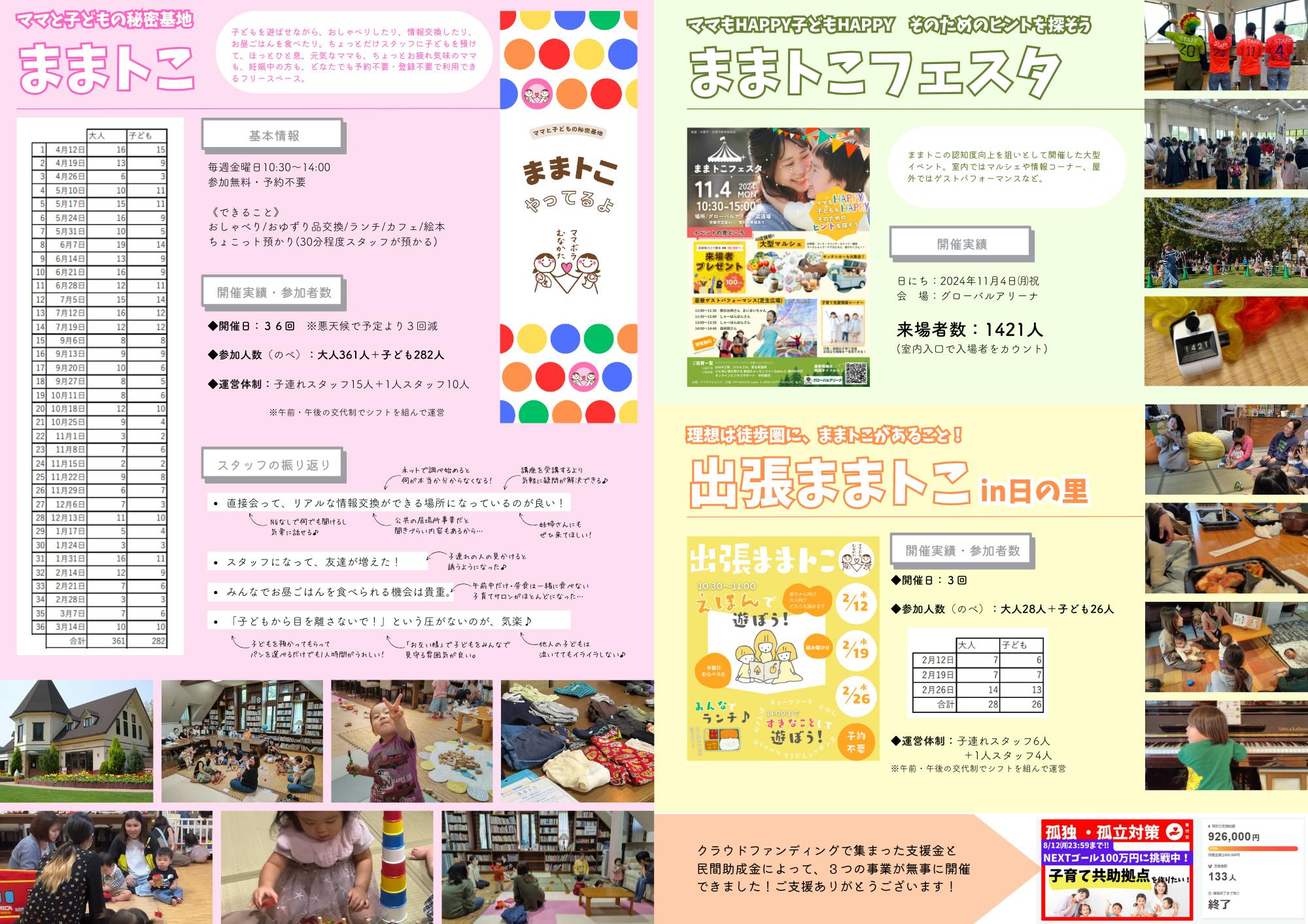 2025/04/11 09:00ご報告が4月になってしまい、申し訳ありません。皆様の温かいご支援のお陰で2024年度の事業が無事に終了したことをここに報告いたします。事業報告ままトこ:36回開催/大人361人+子ども282人出張ままトこ(日の里):3回開催/大人28人+子ども26人ままトこフェスタ:1421人来場(入口カウント)スタッフ振り返り月に1度スタッフミーティングを行い、試行錯誤しながら運営してきました。1年を振り返り、スタッフから出た意見をいくつかご紹介します。★直接会って、リアルな情報交換ができる場所になっているのが良い。★NGなしで何でも聞けて、気軽に話せるのが良い。★妊婦さんが何人も来てくれるようになって嬉しい。もっと来てほしい。★スタッフになって友達が増えた。★みんなでお昼ごはんを食べられる機会が貴重。★「子どもから目を離さないで!」という圧がなくて、お互い様でみんなで見守る雰囲気が良い。★子どもを見ていてもらって、下のパン屋さんに一人でパンを選びに行くだけでも一人時間が嬉しかった。課題この場所を知ったときは最適!と思いましたが、1年開催してみると様々な課題も出てきました。・宗像市民であっても、場所が遠い。・子どもの脱走を防ぐことができず、階段が危険。・パン屋さんのバックヤードに子どもが侵入してしまい、防ぐ手立てが難しい。・2階なのですぐ外へ行けないし、すぐ戻れない。・日陰が少ないので、外遊びができる季節が少ない。・2025年度以降の資金調達が難しい。スポンサーになっていただくには、まだまだ団体として影響力が小さい。(お問合せはいただいたものの、契約には至らなかった)2025年度の展望上記の課題を踏まえ、現在の場所からの移転を決めました!幸い、市内の公民館で毎週定期借用を許可してくださるところが見つかりました!★平屋で、15組は余裕で入れる室内★外は公園。日陰を作ってくれる樹木と、階段と東屋がある。★駐車場は10台以上。「ままトこ」の良さはそのままに、上記の課題をほぼクリアできると考えています!グローバルアリーナの環境も素晴らしかったし、1階のGreenGrassさんのパンも毎週の楽しみだったので移転は残念な気持ちも大きいのですが、ママと子どもにとって、より良い居場所づくりを目指して2025年度も進んでいきたいと思います!▶5月15日㈭にプレオープン▶6月6日㈭から毎週木曜日開催詳細につきましては、Instagramや公式LINE、HPで発信してきますので、今後とも見守っていただければ幸いです。決算報告最後になりましたが、決算報告をいたします。700人もの親子が居場所を利用できたのは、皆様のご支援のお陰です。重ねて御礼申し上げます。繰越金につきましては2025年度の「ままトこ運営費」とさせていただきます。どうぞ今後ともよろしくお願いいたします。 もっと見る