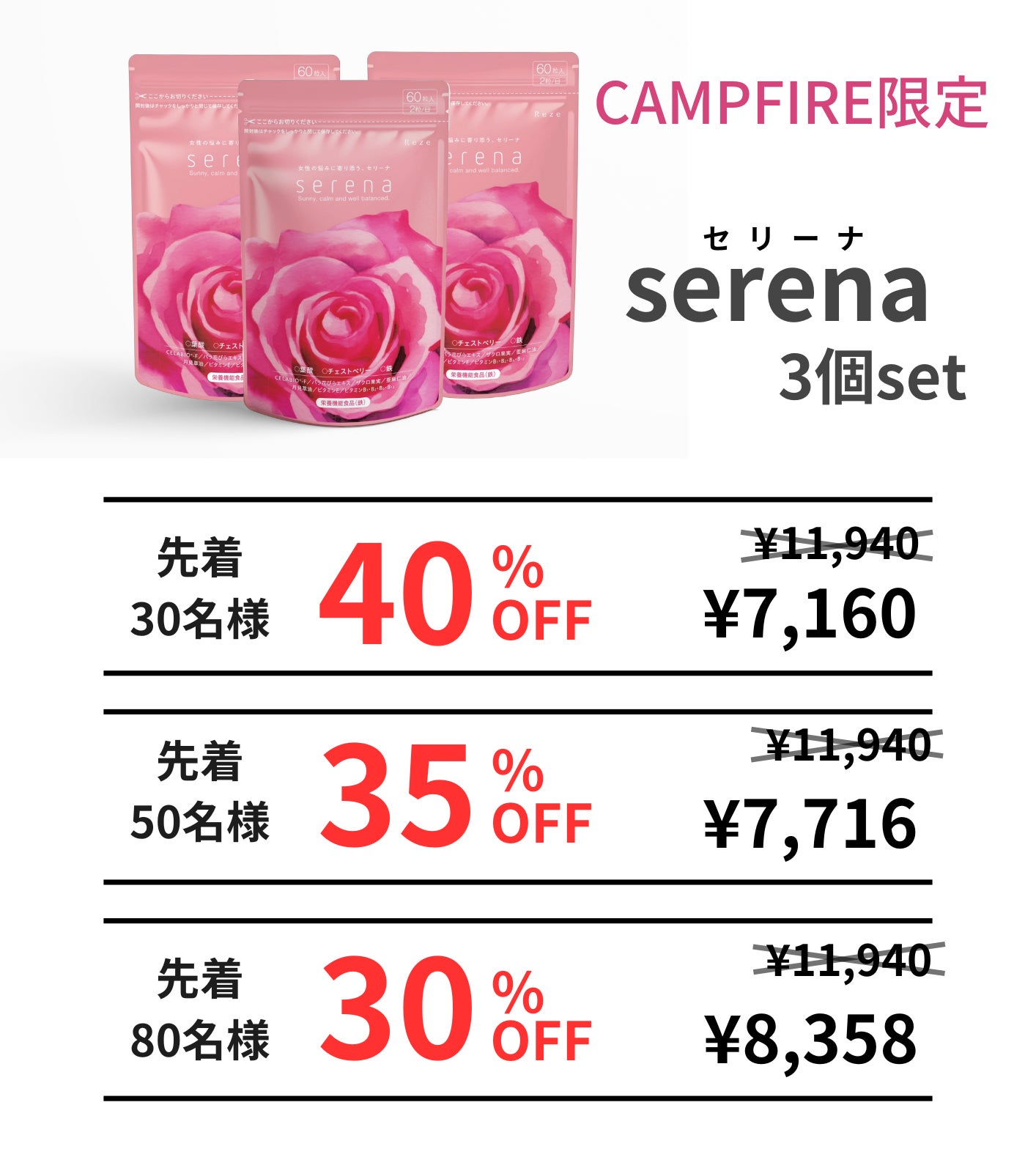 今回Campfire限定のserena3個セットをリターンとしてご用意致しました。